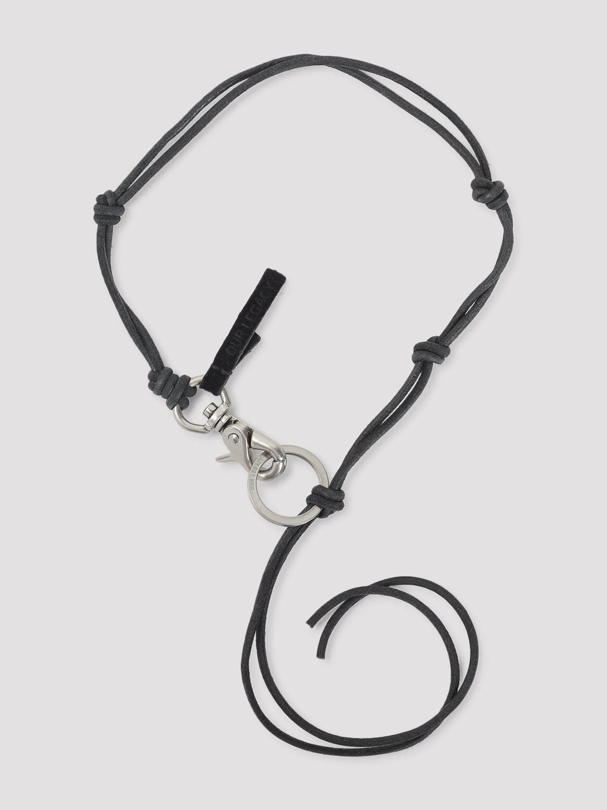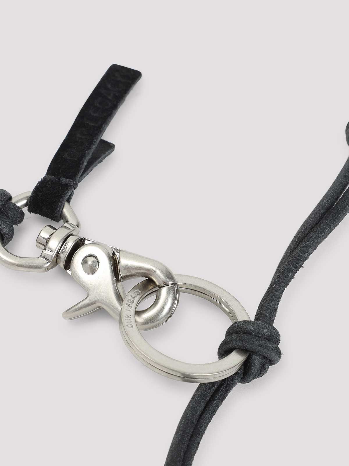 Unser traditioneller Ladon-Schlüsselanhänger aus schwarzem Rindsleder. Armband aus reinem schwarzem Rindsleder mit Knotendetails, silberfarbener Metall-Schlüsselring, silberfarbener metallischer Karabinerverschluss.