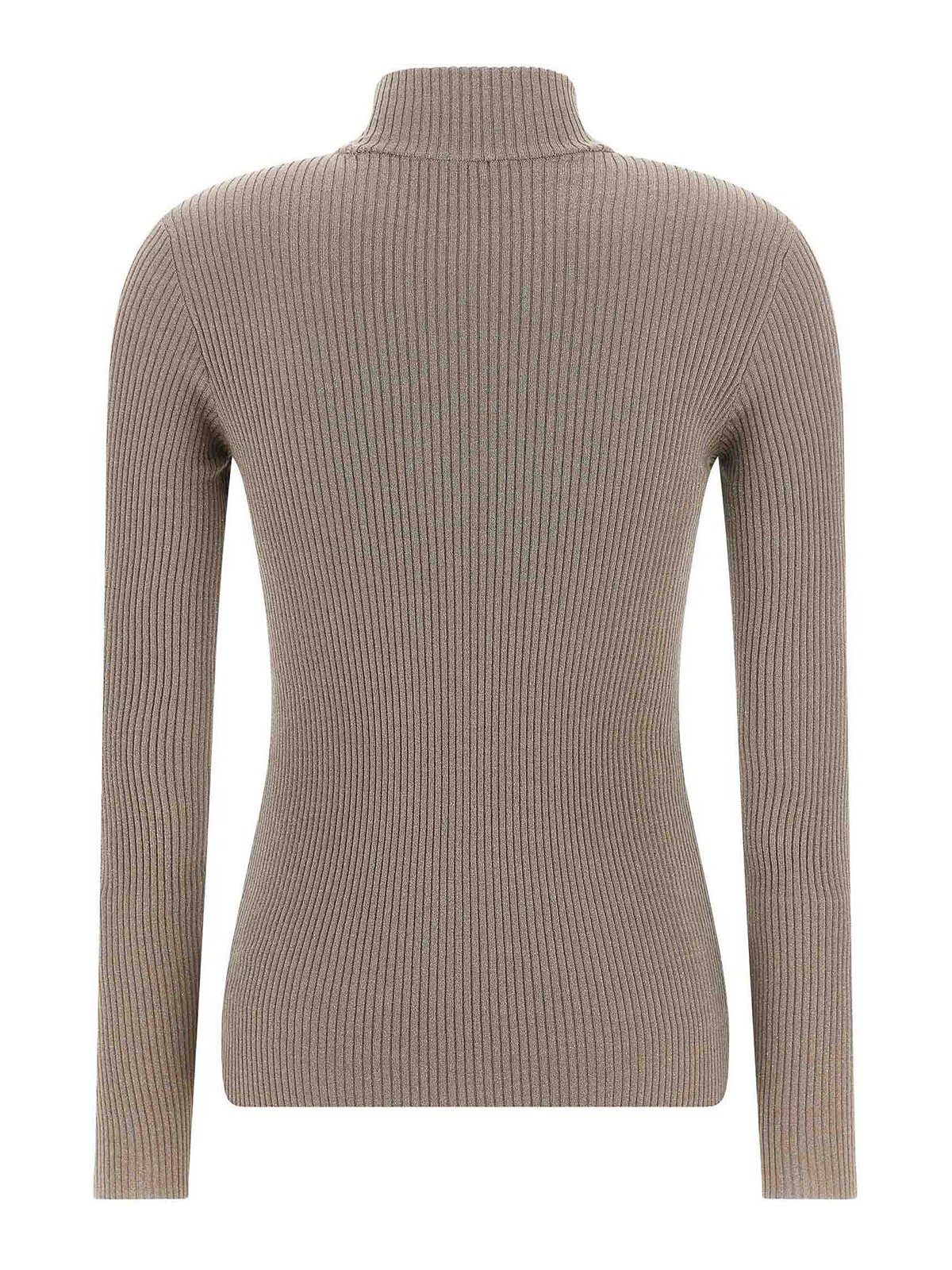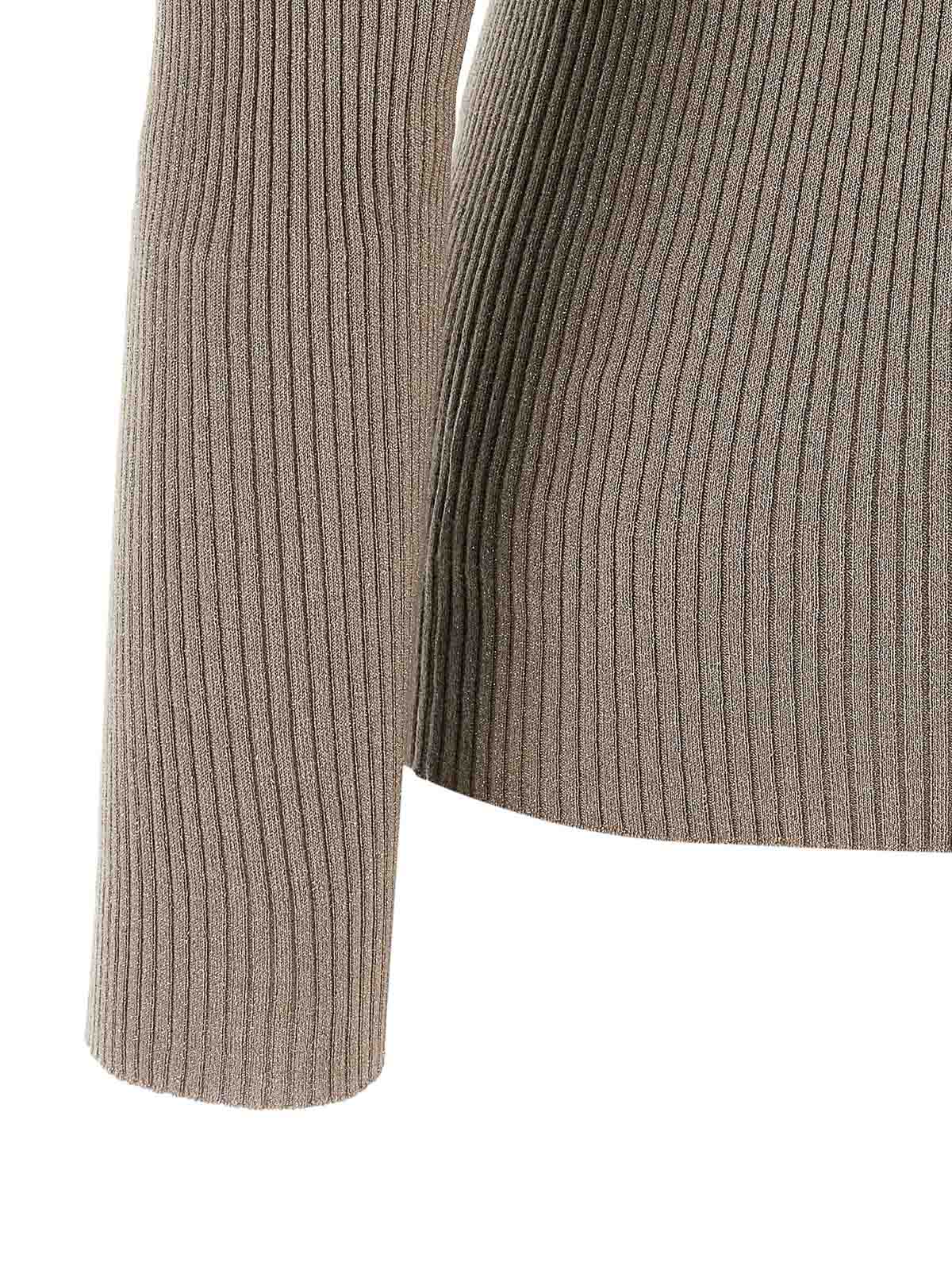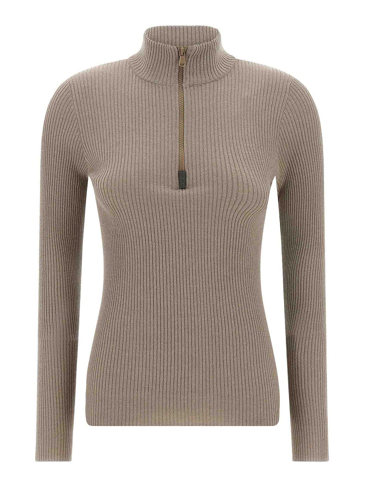 Funkelnder gerippter Rollkragenpullover aus leichtem Stretch-Kaschmirstrick mit halbem Reißverschluss und mobilem Detail, Stehkragen, langen Ärmeln.
