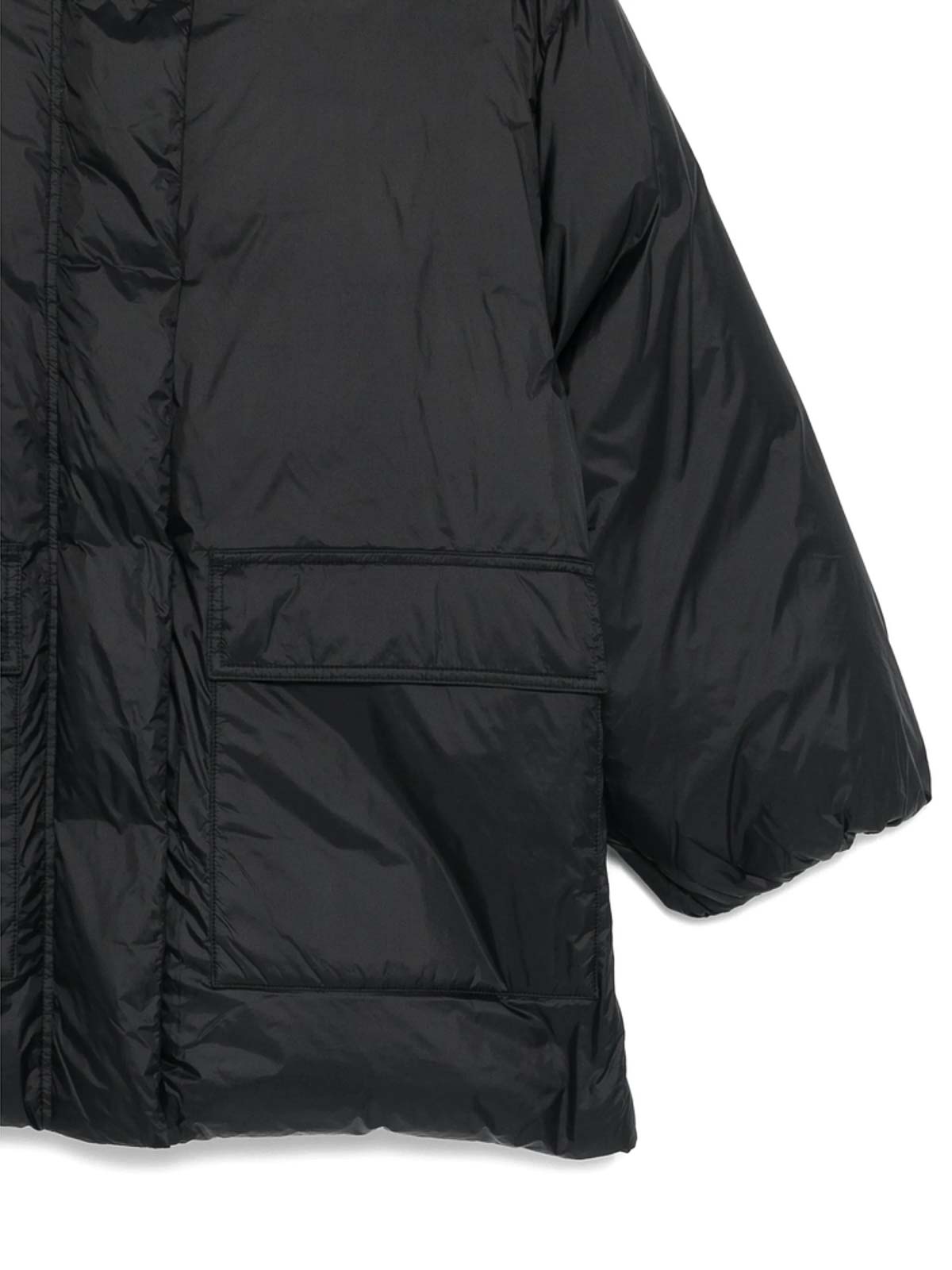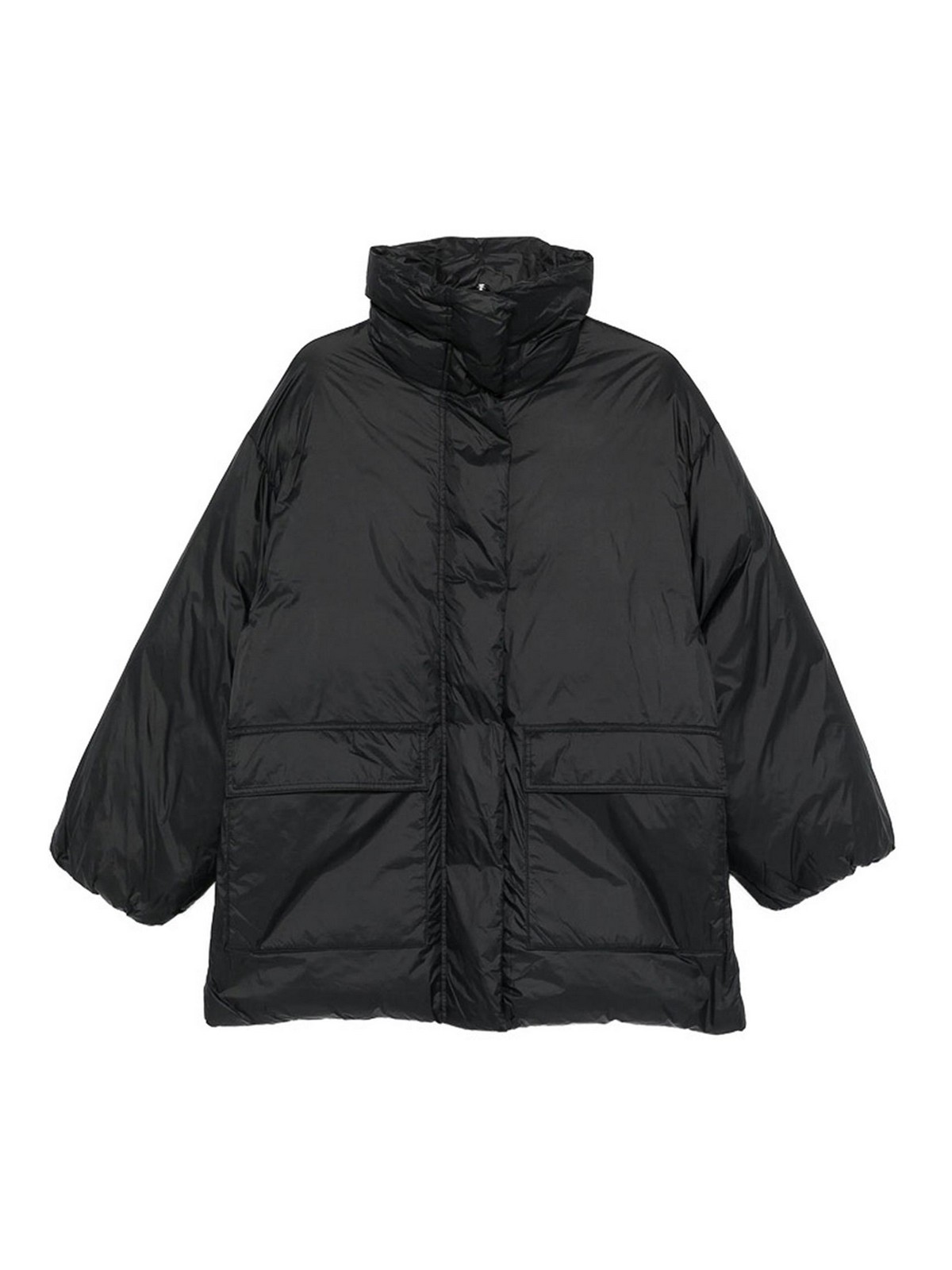 Schwarze Fronttaschen mit hohem Kragen, Knopfverschluss, weite Ärmel, gesteppter Effekt