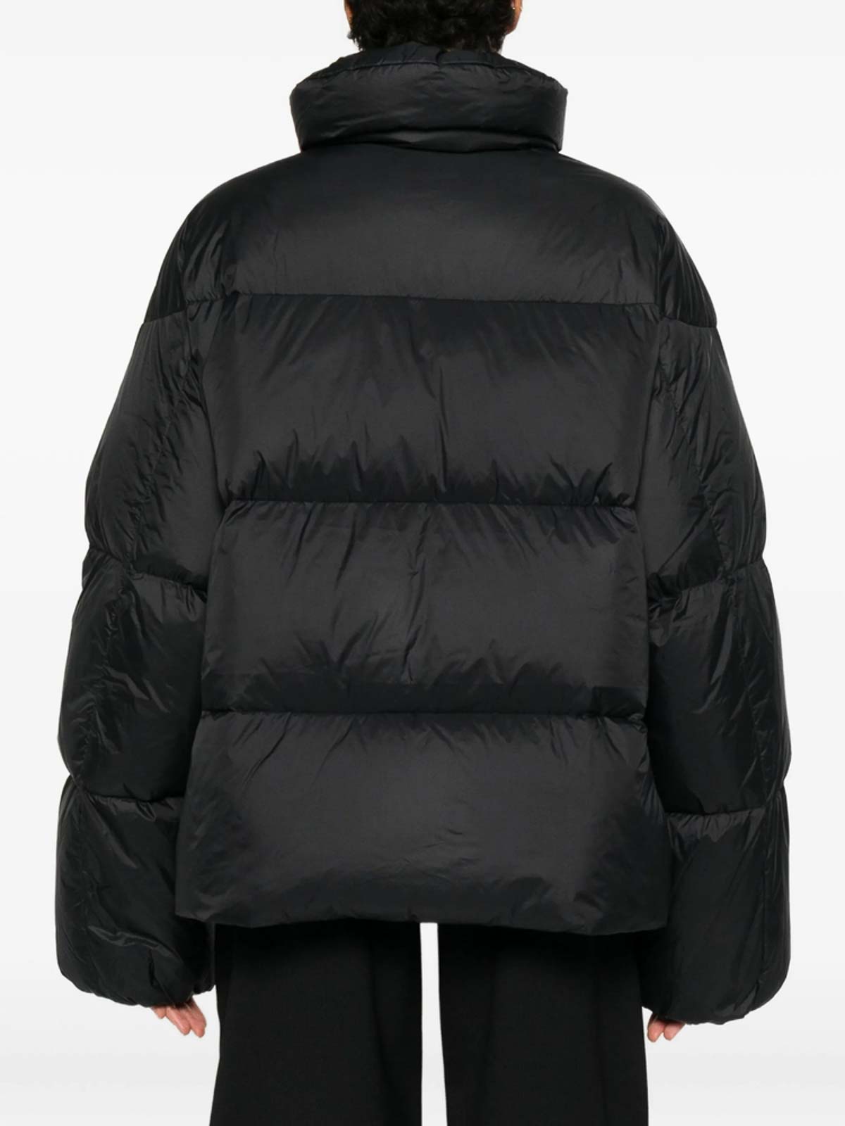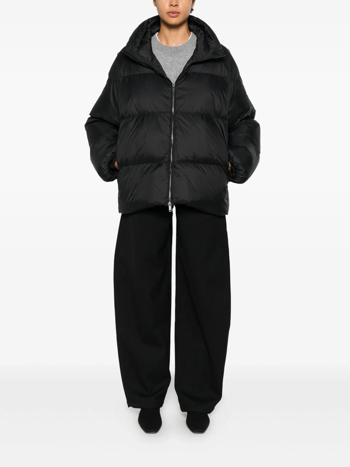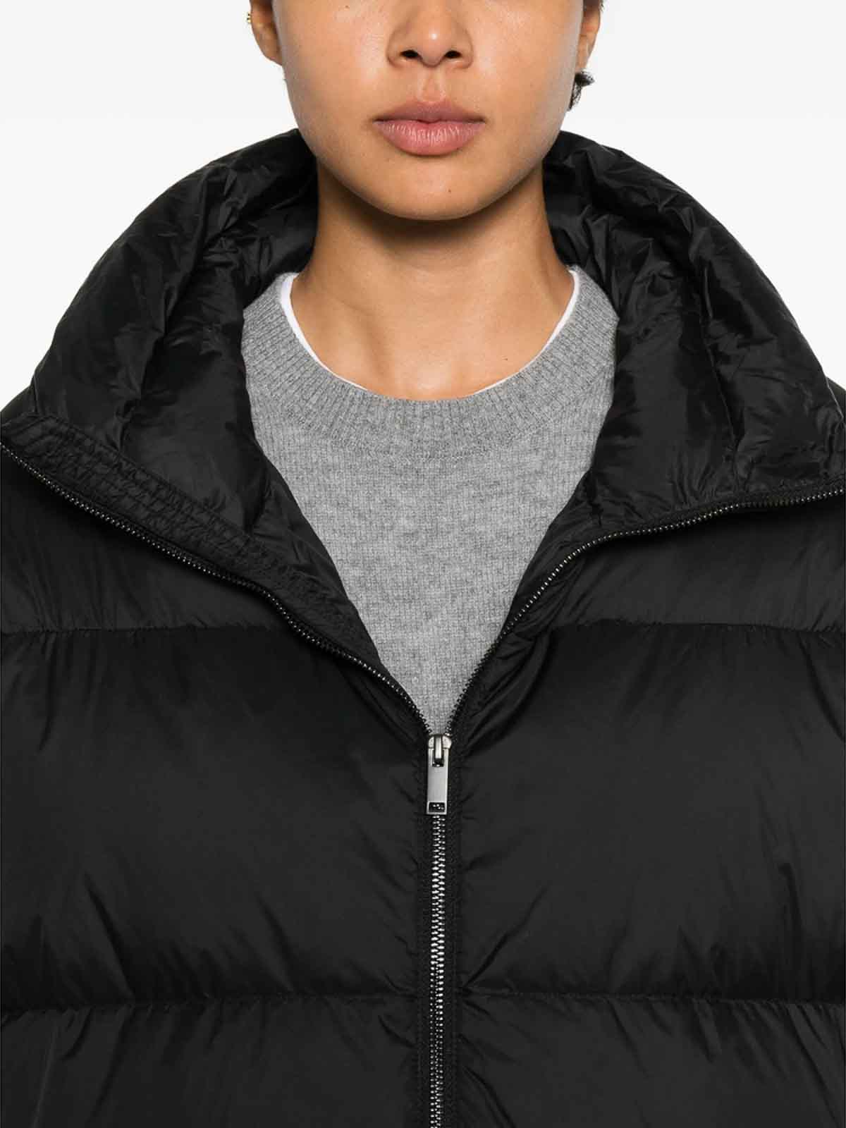 Schwarzer Reißverschluss, hoher Halsausschnitt, horizontale Steppung, lange Ärmel, gerader Saum