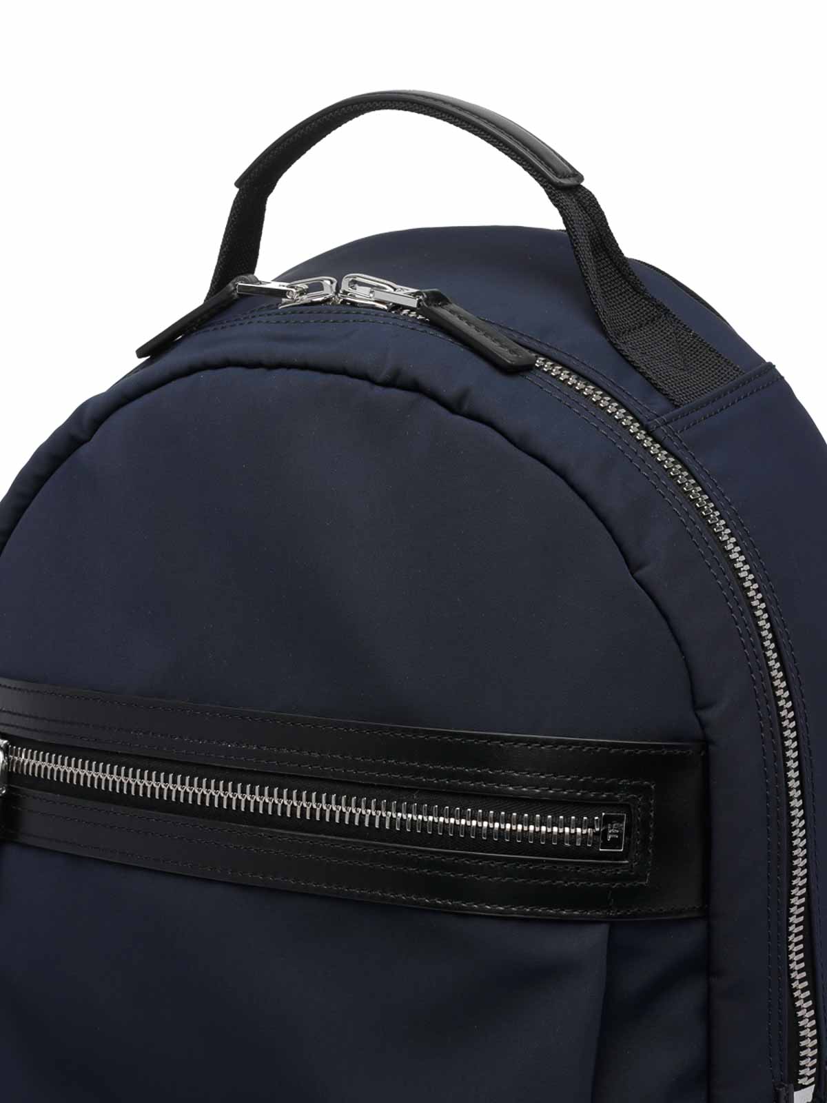 Blauer Rucksack aus recyceltem Nylon von Tom Ford, Reißverschluss, 2 Innentaschen, Laptopfach, 1 Griff, verstellbare Gurte, vorderes Mini-Logo