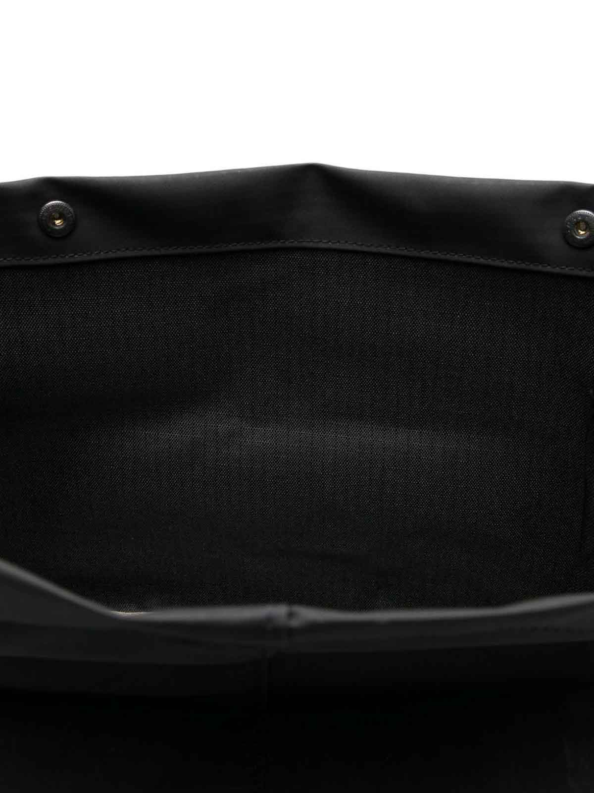Schwarze Rollverschlüsse mit Schnallenriemen, Beuteltasche, aufgedrucktes Logo, verstellbare Schultergurte