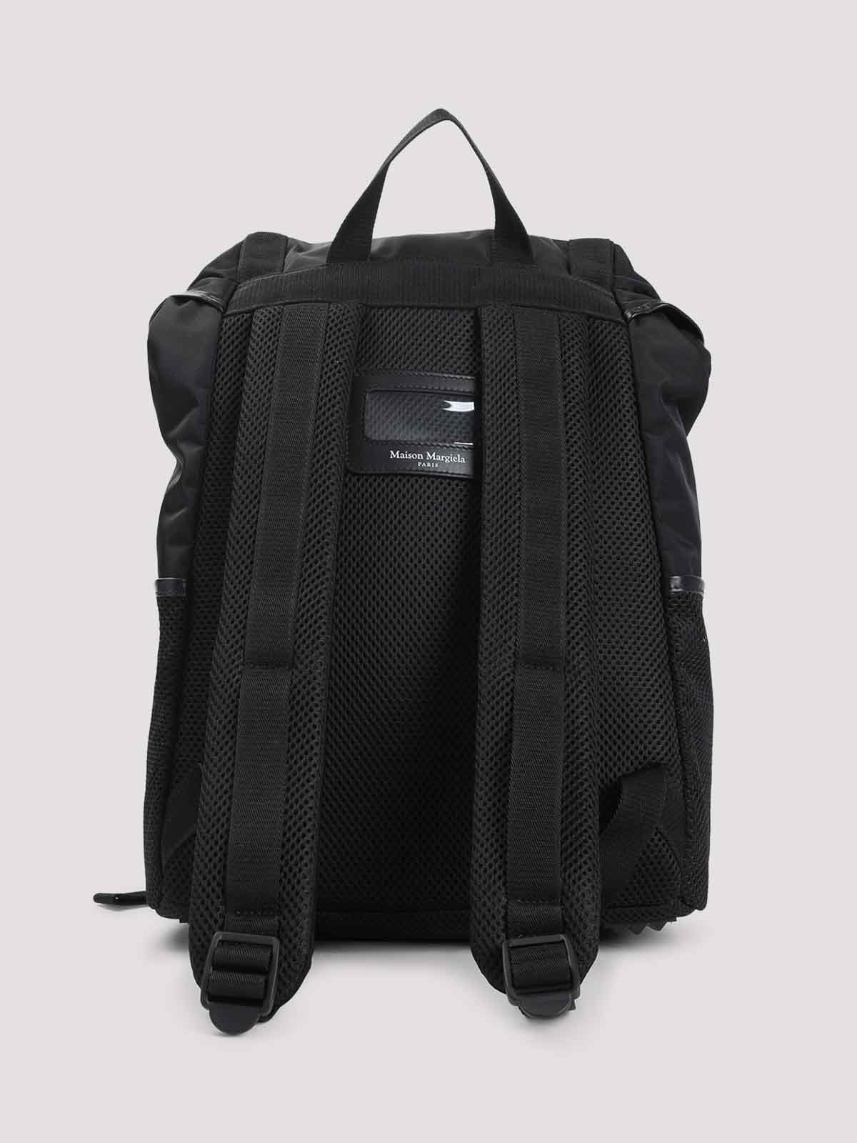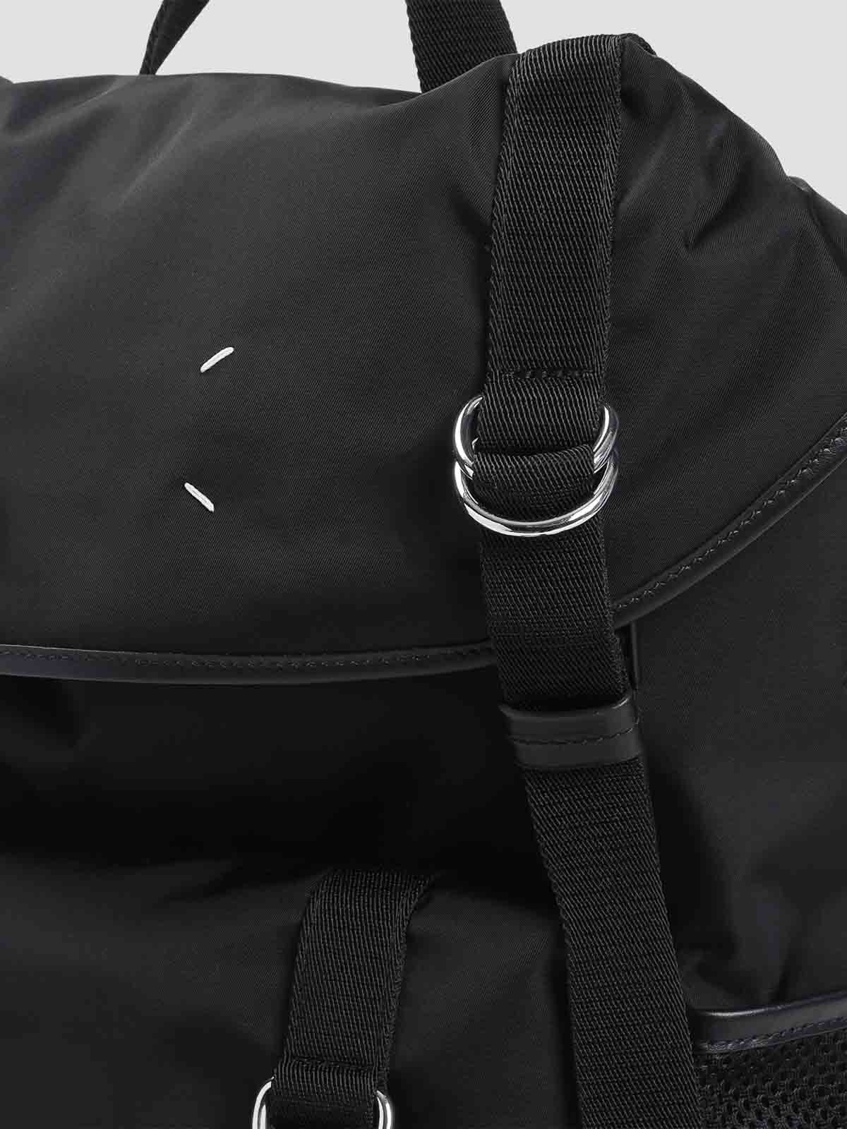 Maison Margiela Schwarzer High-Tech-Rucksack, Größe M, reine schwarze Oberseite, kontrastierende weiße Signaturnähte, Klappendesign mit seitlichen verstellbaren Riemen, Pattentasche mit verstellbarem Riemen, gepolsterter Schultergurt, Rückseite, gepolsterter Rücken, Logo-Tag, ein Hauptfach