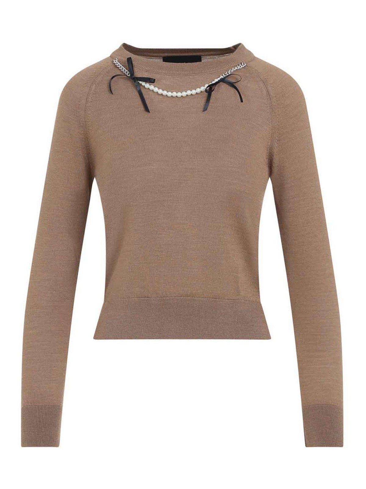 Simone Rocha Classic und Pullover, gefertigt aus beigem und rundem Halsausschnitt, schwarzen Schleifen, Kette und Perlen, Verzierung, lange Raglanärmel, feine Rippkanten