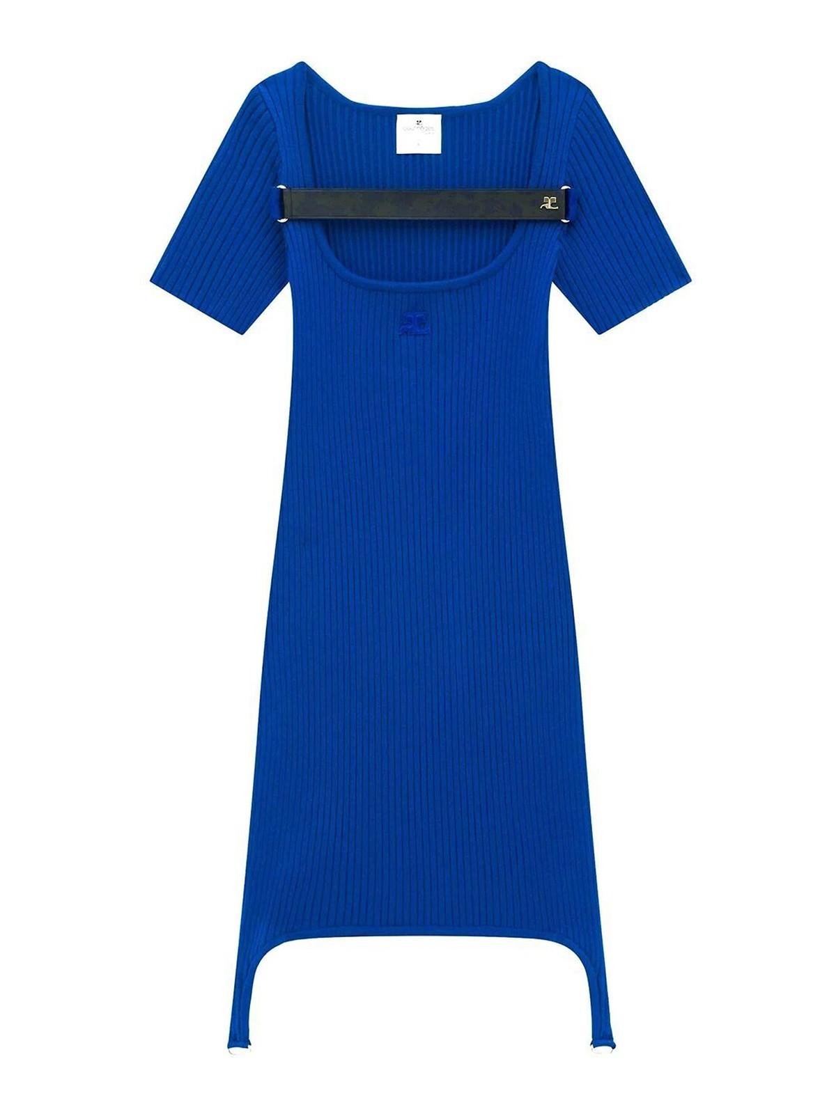 Kurzärmliges Kleid aus Rippstrick mit Hosenträgern und Riemen aus Metall