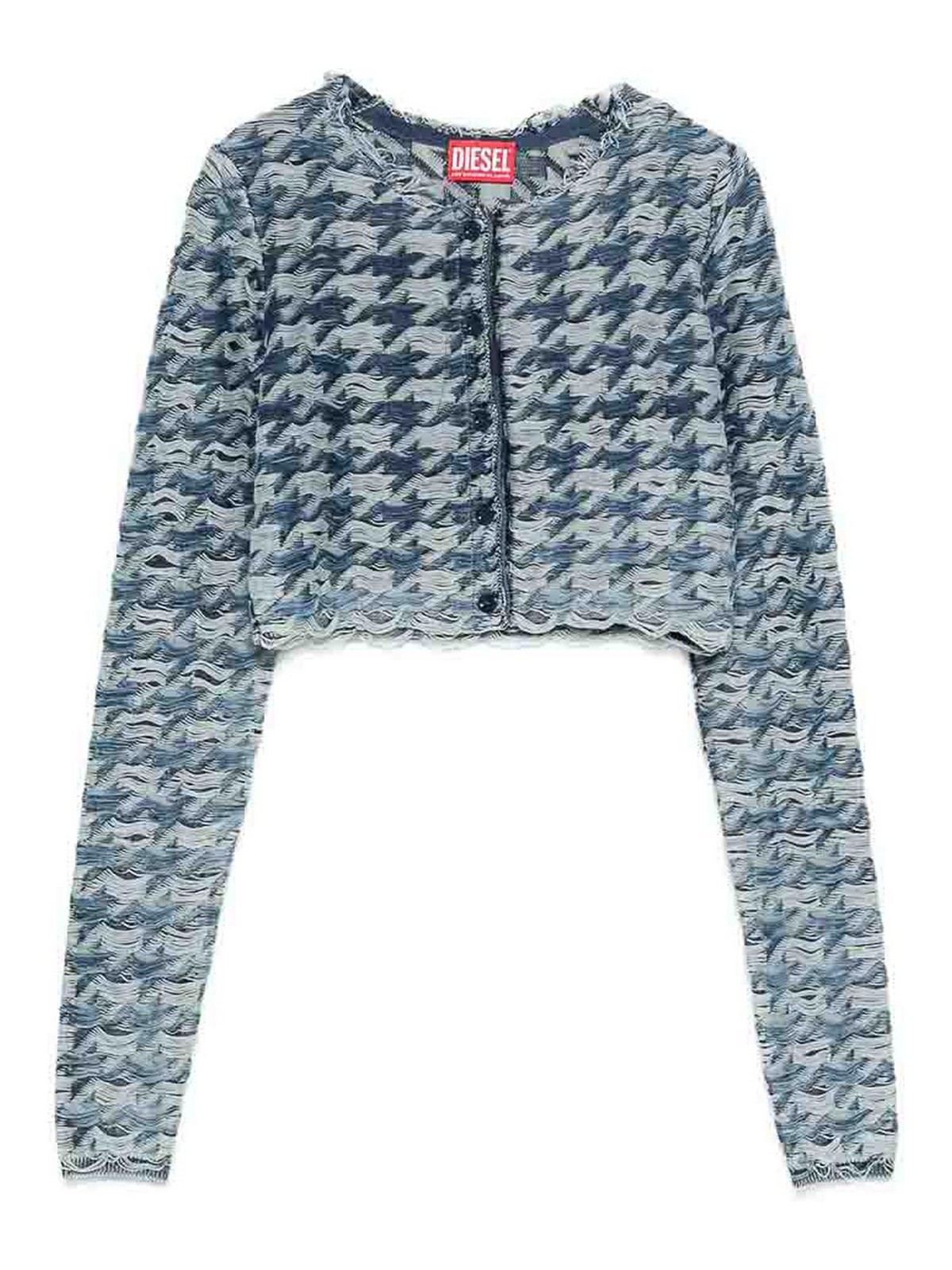 Blaues Hahnentrittmuster, verkürzter Saum, lange Ärmel, Knopfleiste, ausgefranste Kanten