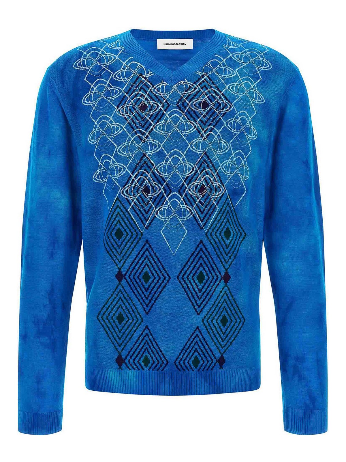 Hathas Jacquard-Strickpullover mit geometrischen Mustern, die von der bulgarischen Folklore inspiriert sind und über einem psychedelischen Batik-Print, einem V-Ausschnitt, langen Manschettenärmeln und einem Stirnband liegen.