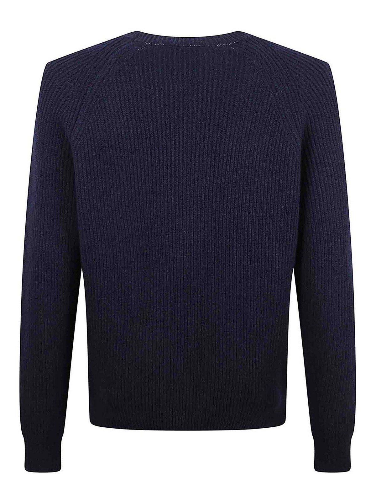 Englischer gerippter Pullover aus blauer Wolle, Rundhalsausschnitt mit geripptem Saum und Bündchen.