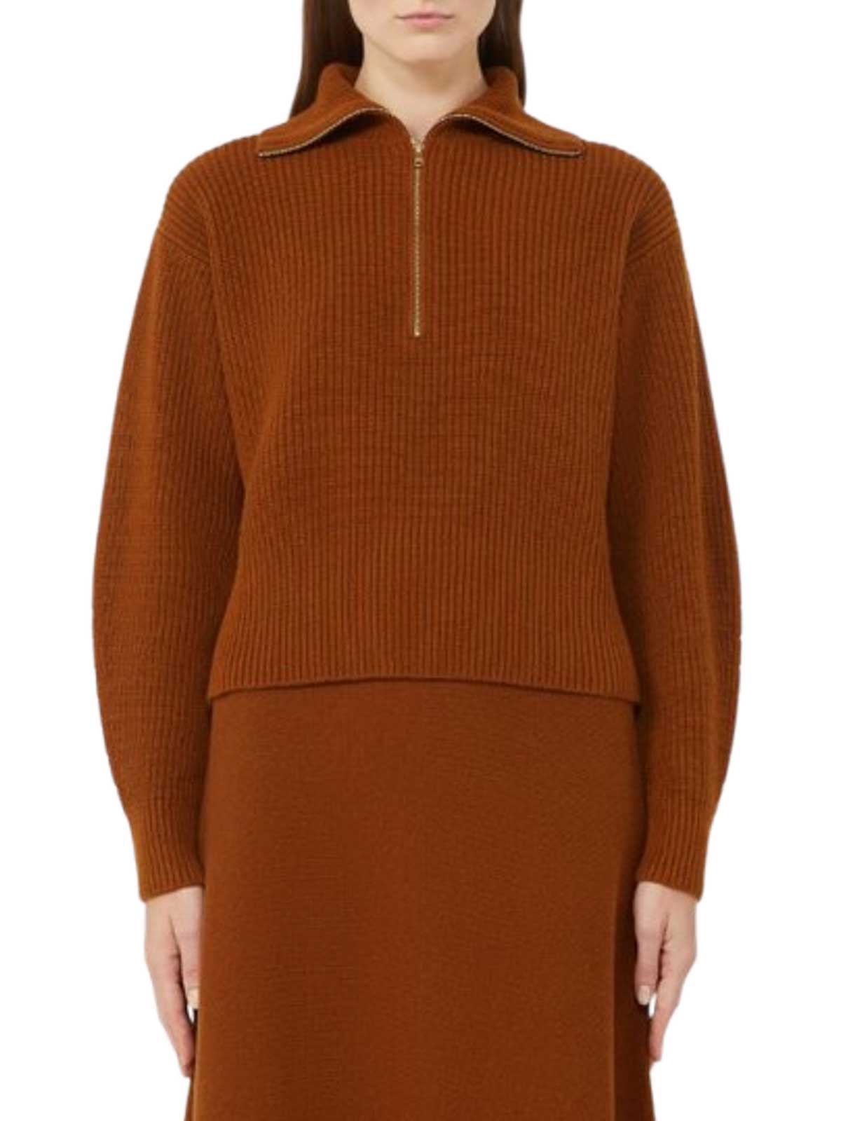 Hellbrauner Pullover aus Wolle und Cashmere mit englischem Rippstrick. Stehkragen mit Halbmetallreißverschluss und personalisiertem Reißverschluss. Lange, tief geschnittene Ärmel.