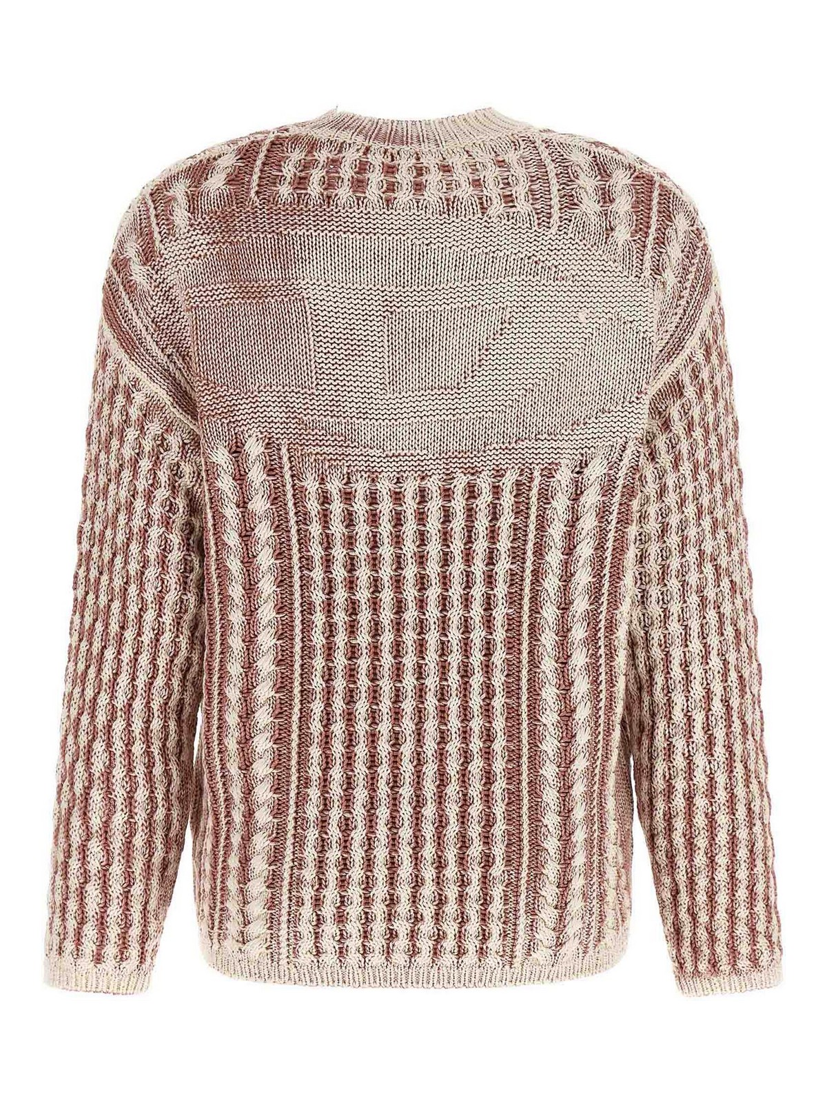 k-moise' Baumwollpullover mit Zopfmuster, ovalem Maxi-D-Logo mit Rückenintarsie, Rundhalsausschnitt, lange Ärmel mit Manschetten und abgesenkten Schultern. Das Kleidungsstück ist auf der Innenseite mit einer speziellen Drucktechnik behandelt, die auf der Außenseite unregelmäßige Farbeffekte erzeugt und die Textur durch Kontraste und Schattierungen verstärkt.