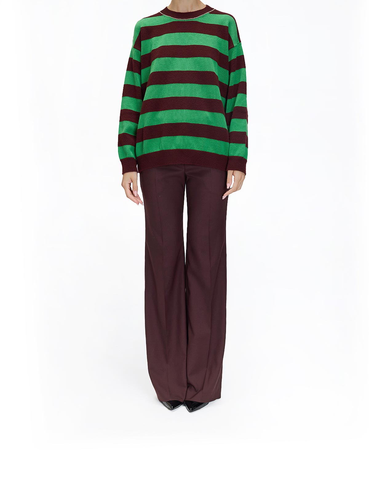 Übergroßer gestreifter Pullover aus Lammwollmischung in mehrfarbigem Grün. Übergroßer Pullover aus Wollmischung von Paul Smith mit Streifenmuster. Er verfügt über abgesenkte Schultern und einen Rundhalsausschnitt, der mit kontrastierenden Nähten versehen ist. Oversize-Passform, tief angesetzte Schultern, Rundhalsausschnitt, kontrastierende Nähte am Ausschnitt, gerippter Saum und Bündchen sowie Streifenmuster. Farbe: mehrfarbiges Grün. 57% Wolle, 43% Baumwolle.