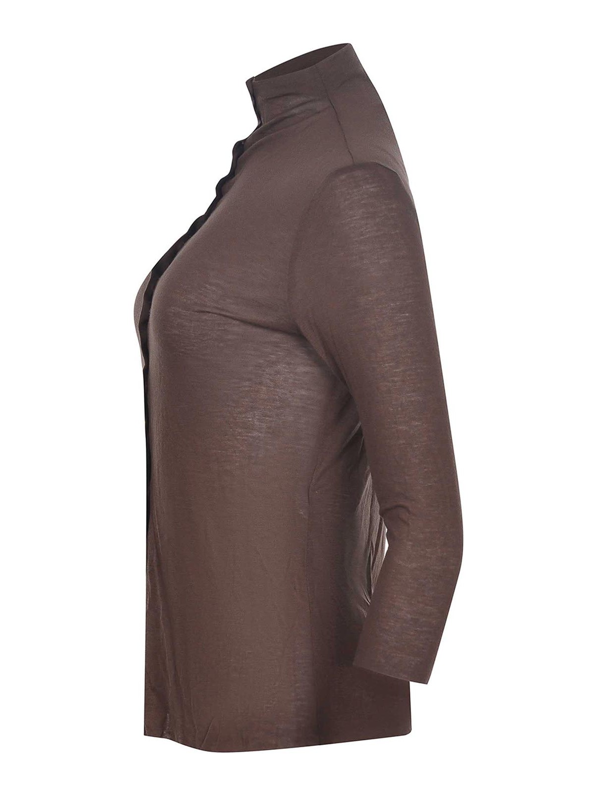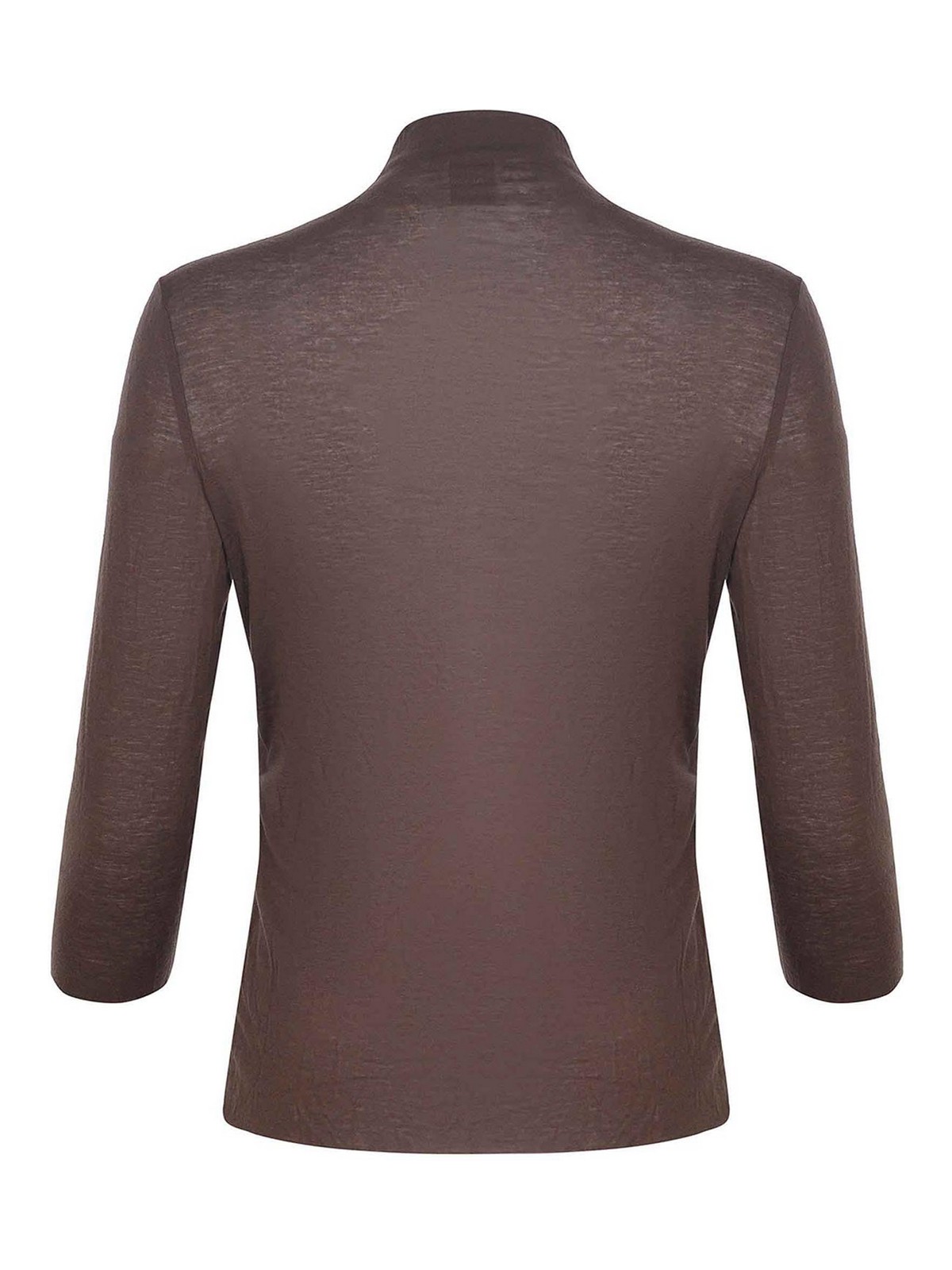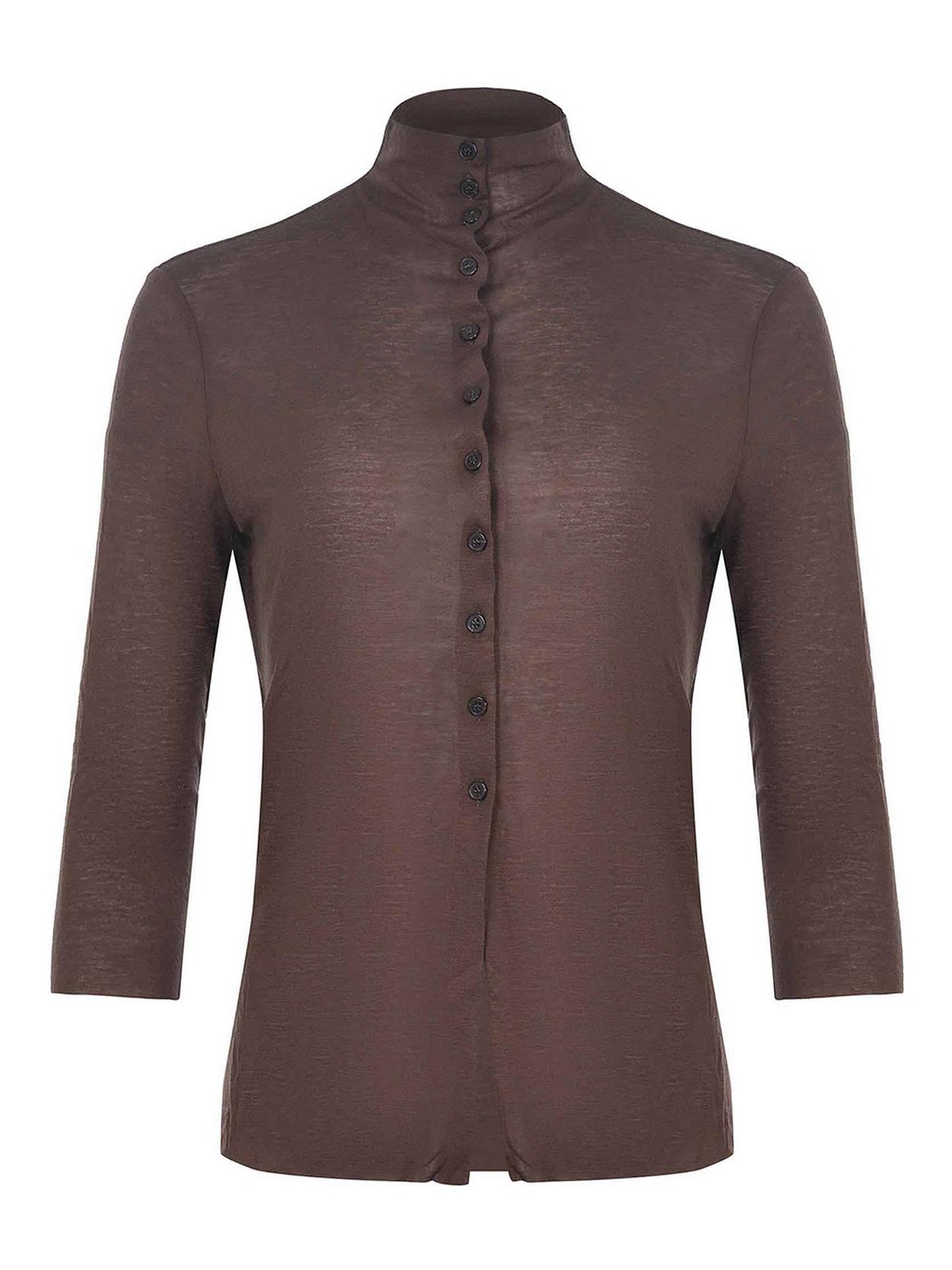 Alysi Pullover aus einer schokoladenfarbenen Wollmischung. Halbtransparent. Stehkragen. Verschluss mit Knöpfen auf der Vorderseite. Dreiviertelärmel. 70% Viskose 30% Wolle. hergestellt in Italien.
