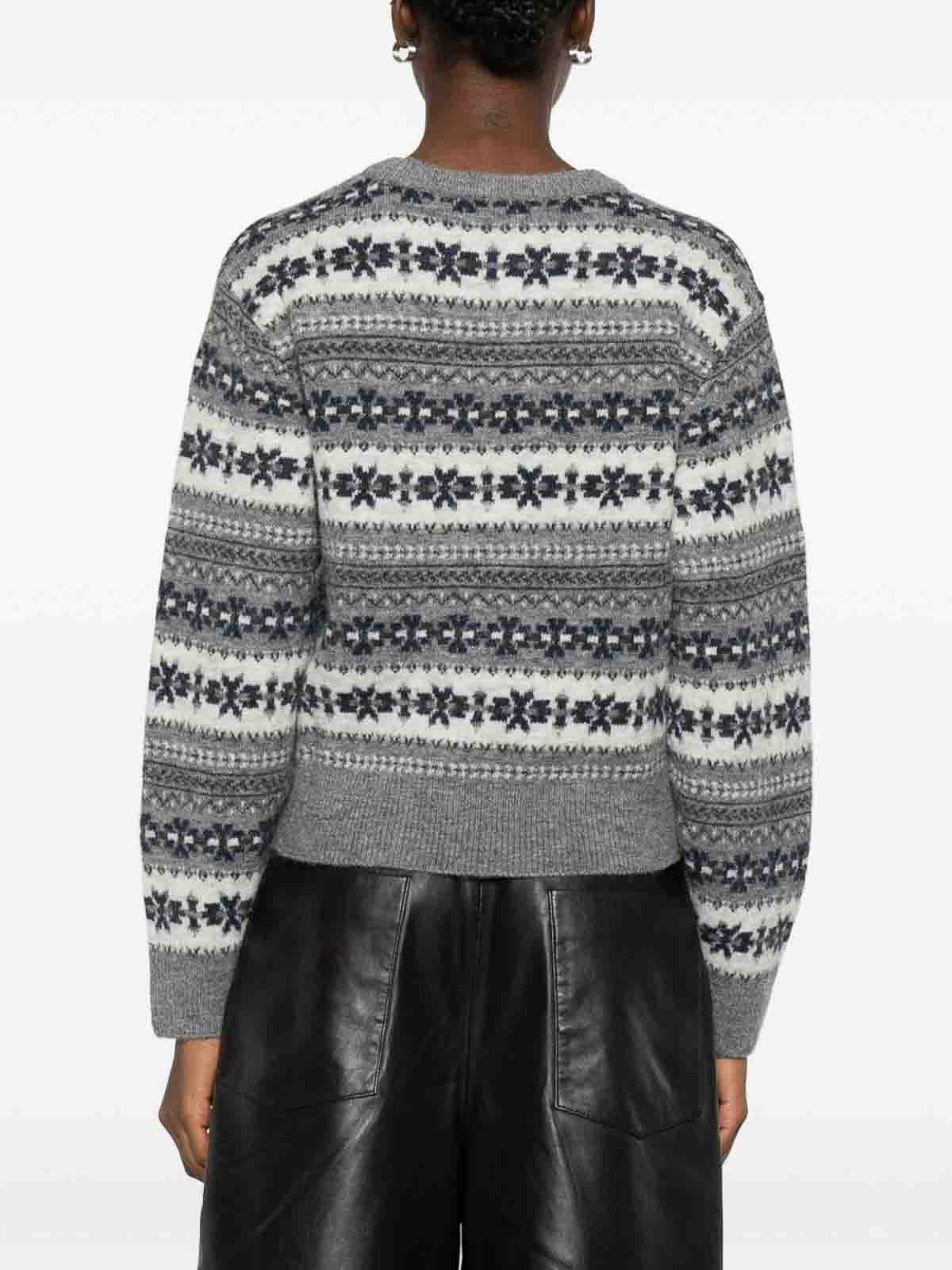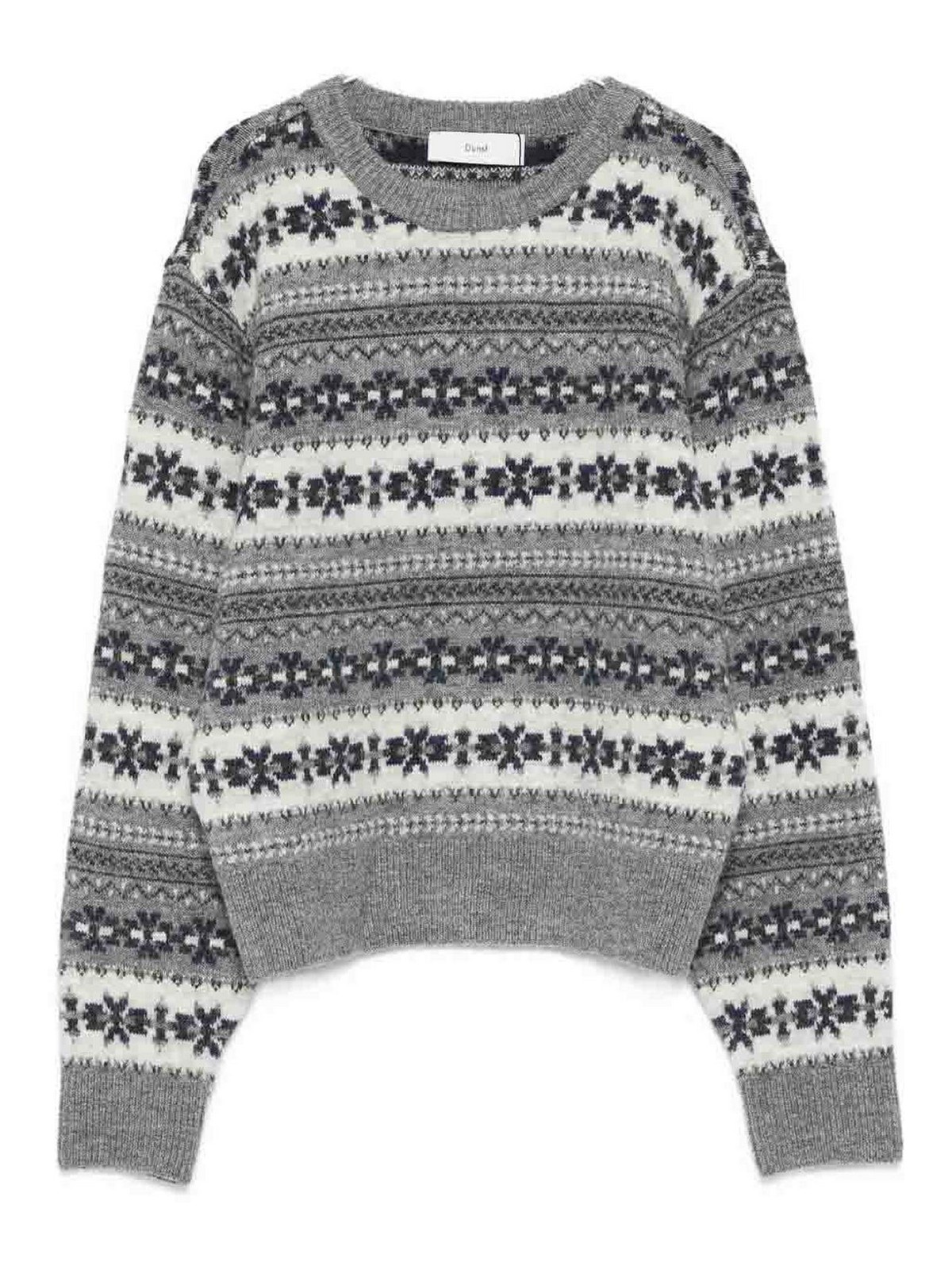 Rundhalsausschnitt mit grauem Fairisle-Muster, lange Ärmel, Rippbündchen, gerippter Saum