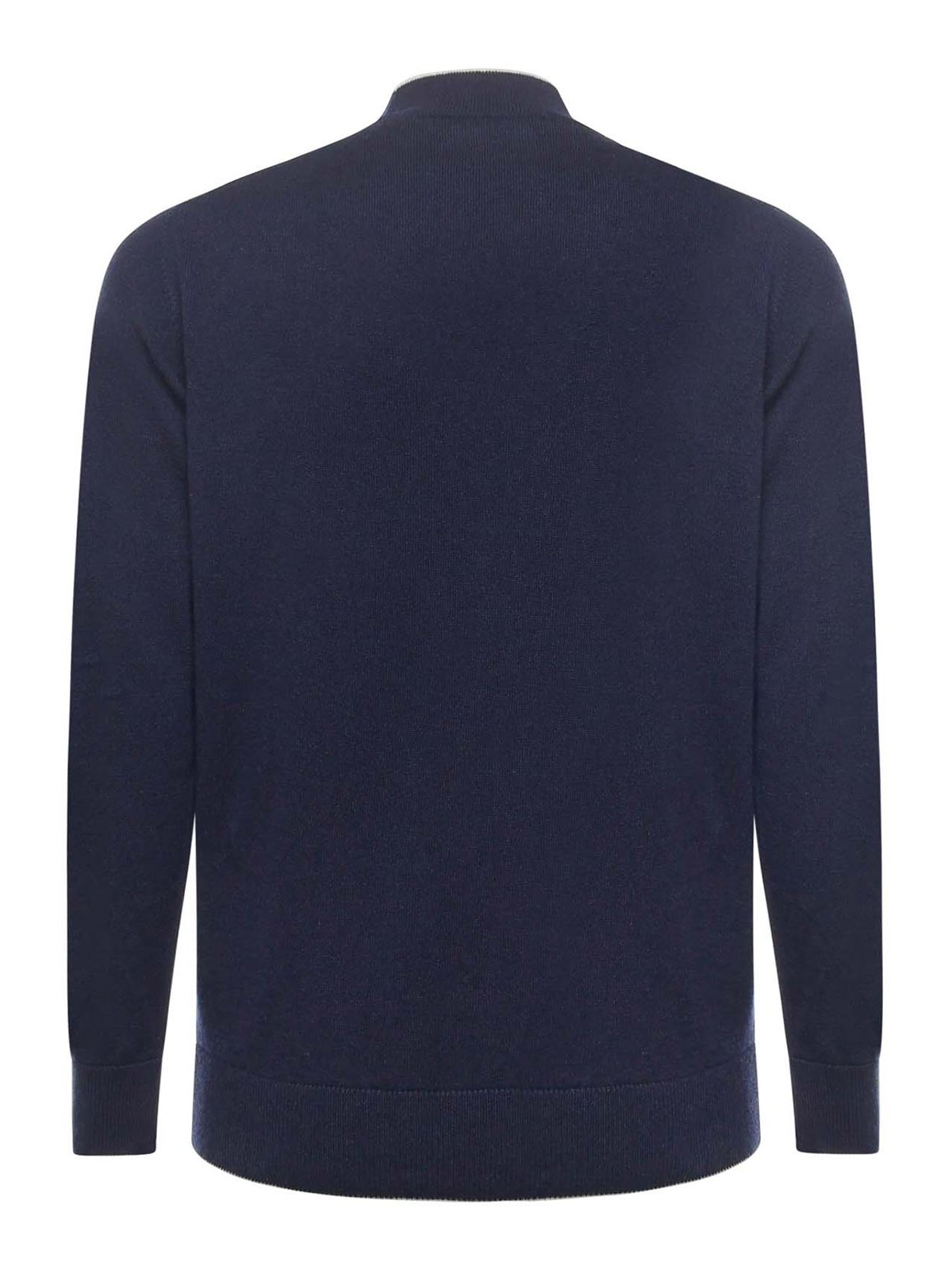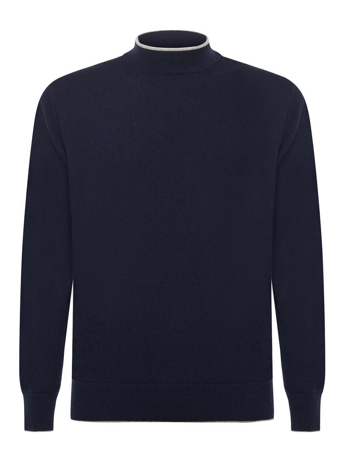 gefertigt aus reinem Kaschmir, hoher Kragen mit kontrastierendem Rand, lange Ärmel, gerippte Bündchen an Ärmeln und Saum, die auf dem Foto abgebildete Größe ist M, hergestellt in Italien, Designerfarbe: marineblau, hellgrau