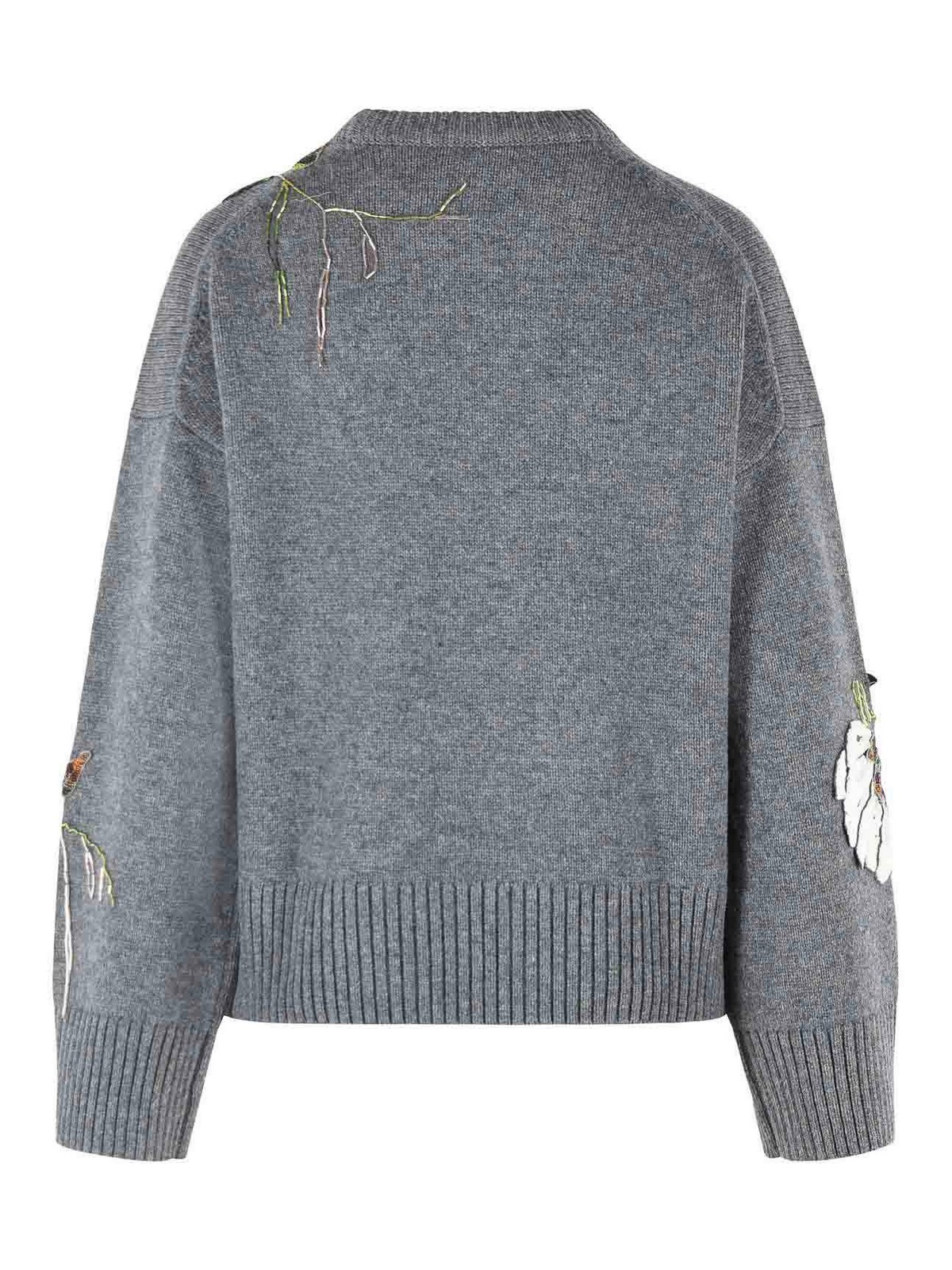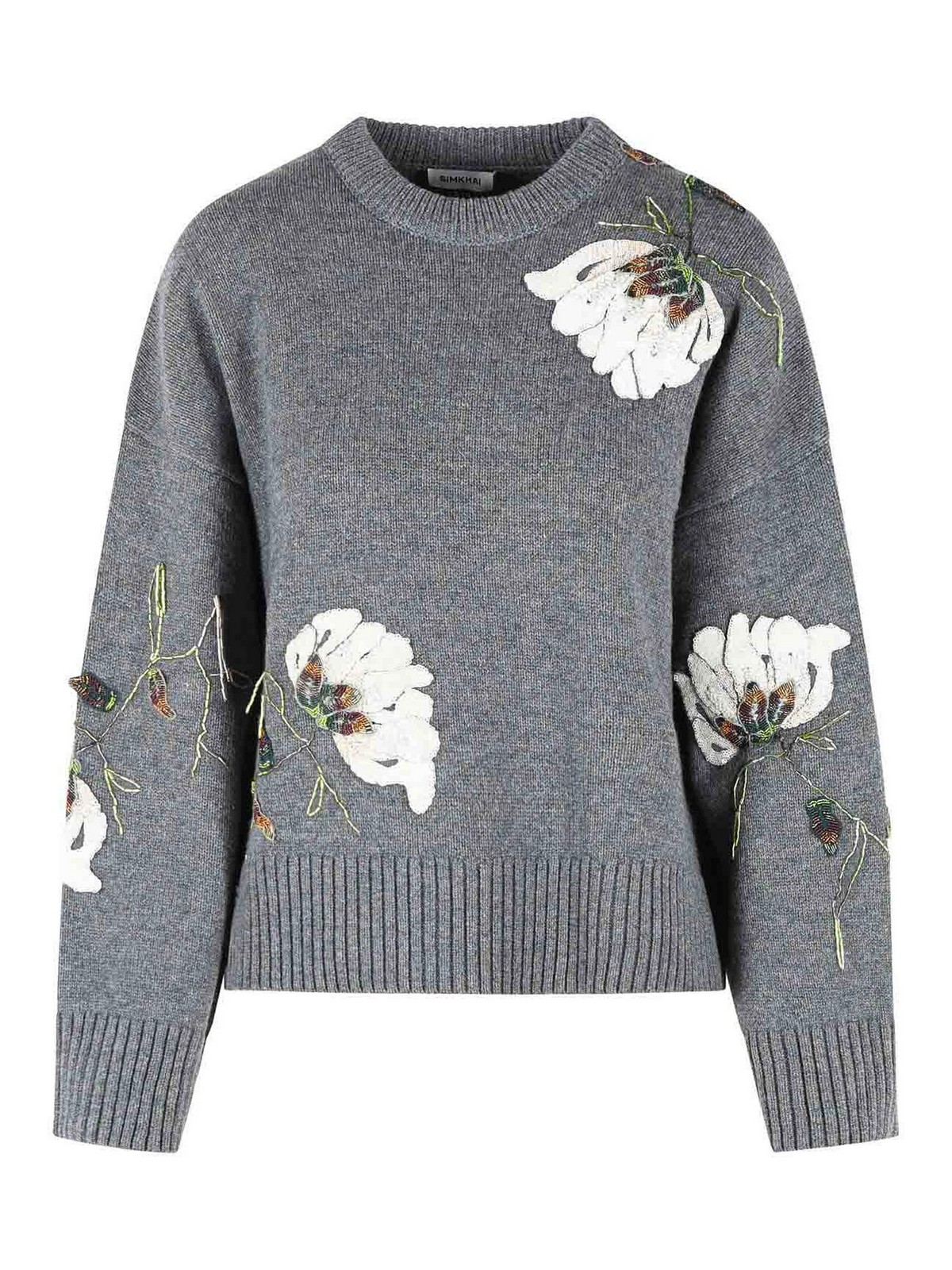 Fein gestrickter, weit gerippter Rundhalsausschnitt, Blumenverzierungen aus Strass und Perlen, gerippter Saum und Bündchen