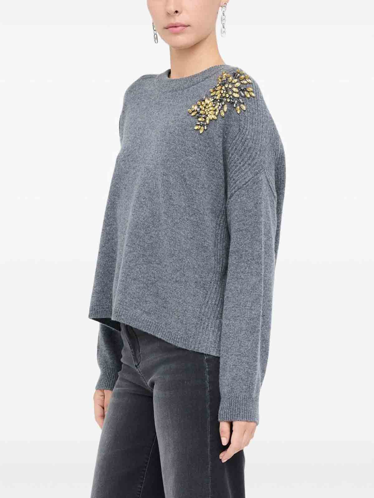 Grauer Rundhalsausschnitt mit Schmucksteinen und langen Ärmeln, lockere Passform