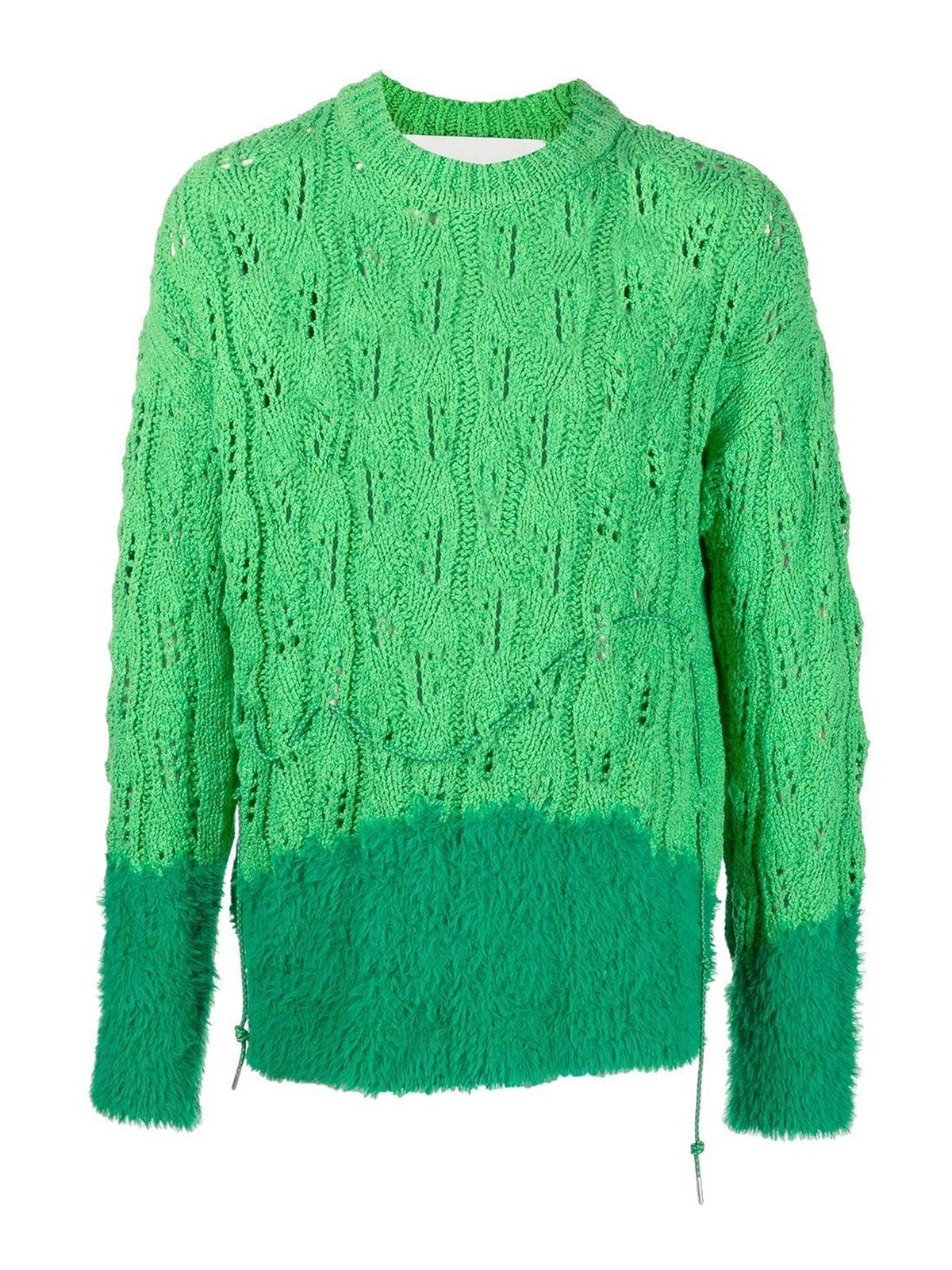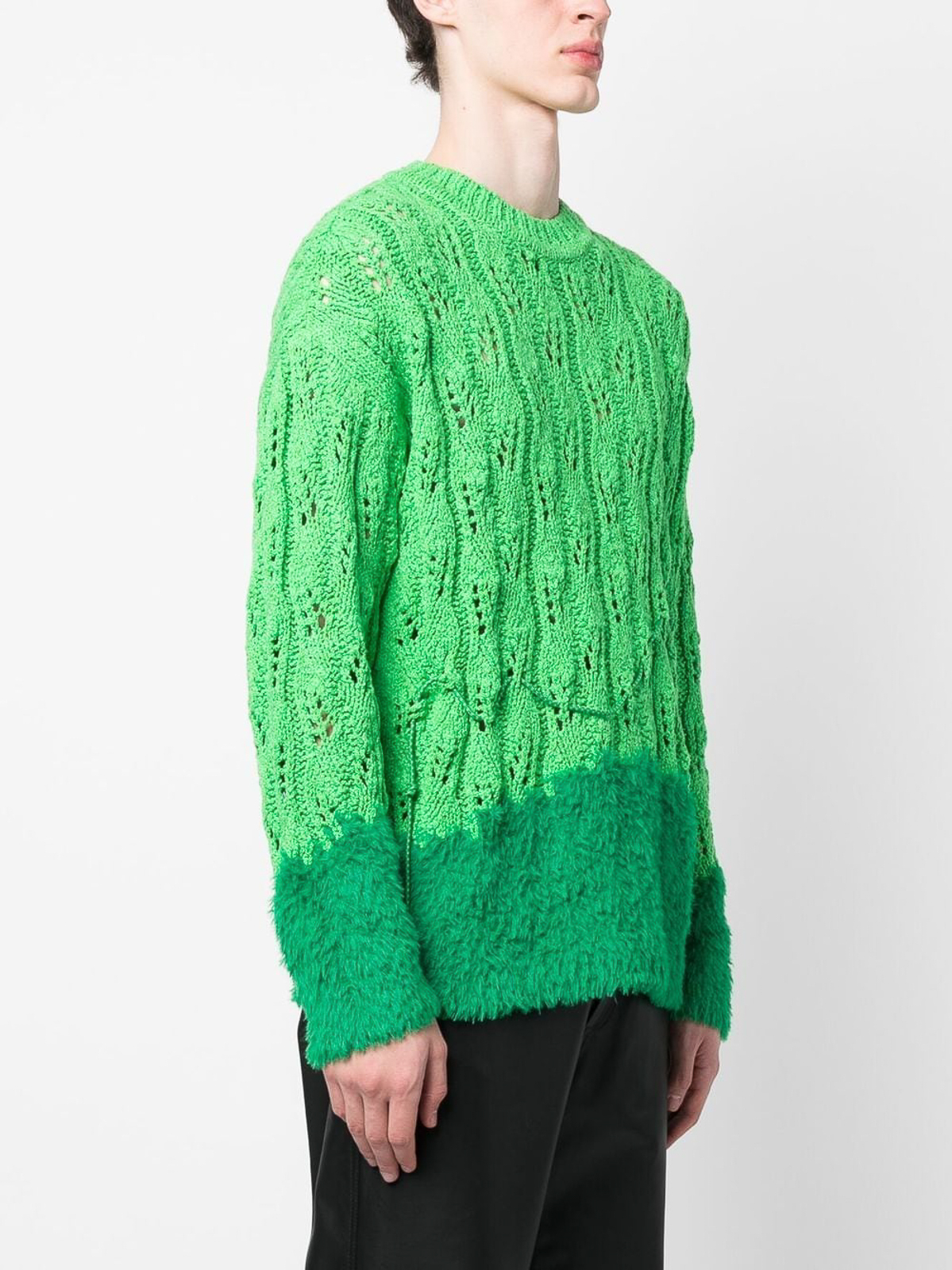 Strickpullover mit Fleece-Detail von Andersson Bell mit grüner Fleece-Textur aus Baumwollmischgewebe, offenem Strick, Rundhalsausschnitt, langen Ärmeln und geradem Saum.