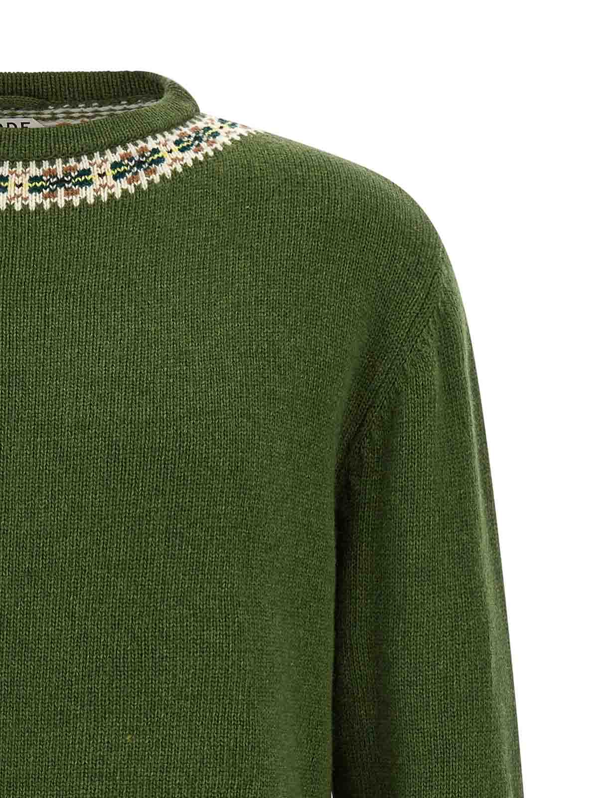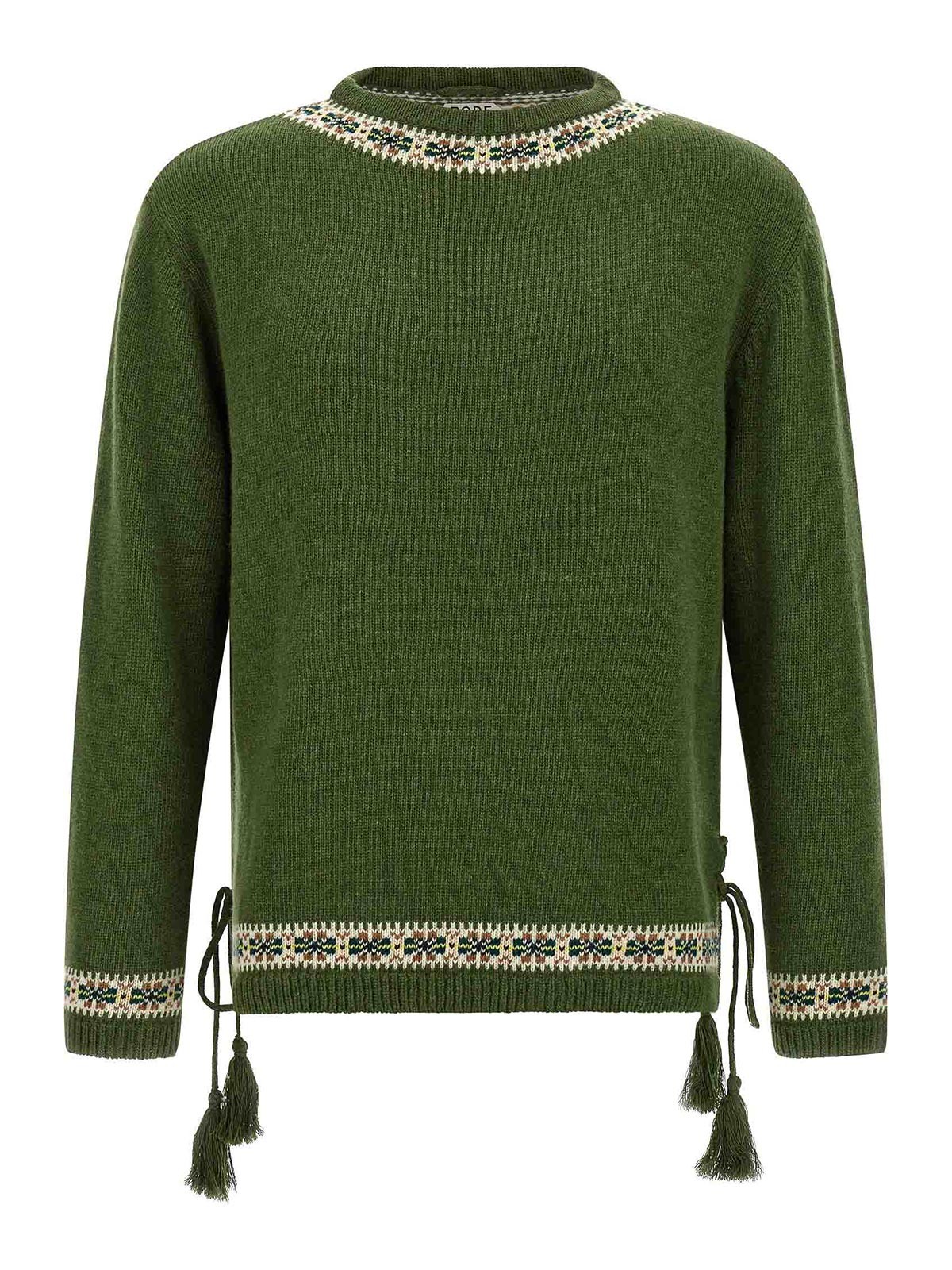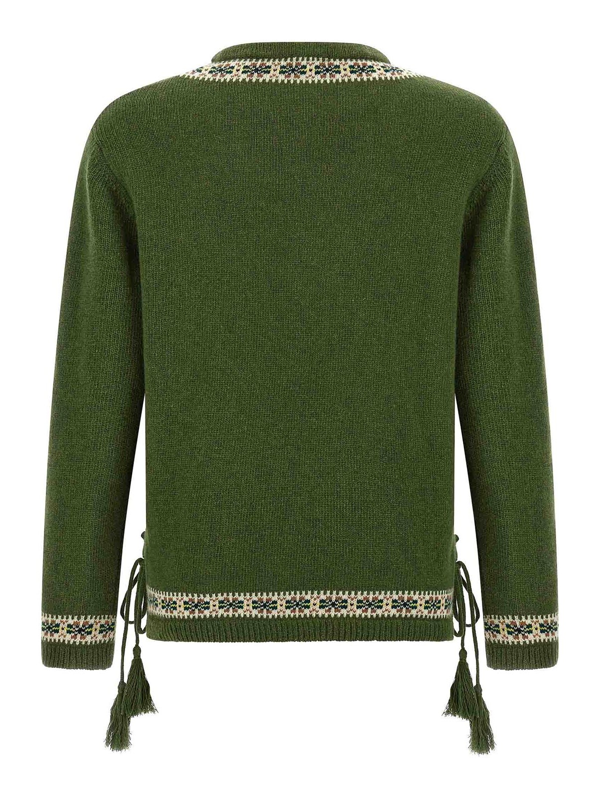 Pullover „Moritz“ aus Schurwolle mit Jacquard-Streifenmuster „Fair Isle“, Rundhalsausschnitt, lange Ärmel mit Manschetten und abgesenkter Schulter, Seitenschlitze mit Spitze und Quaste am Ende.