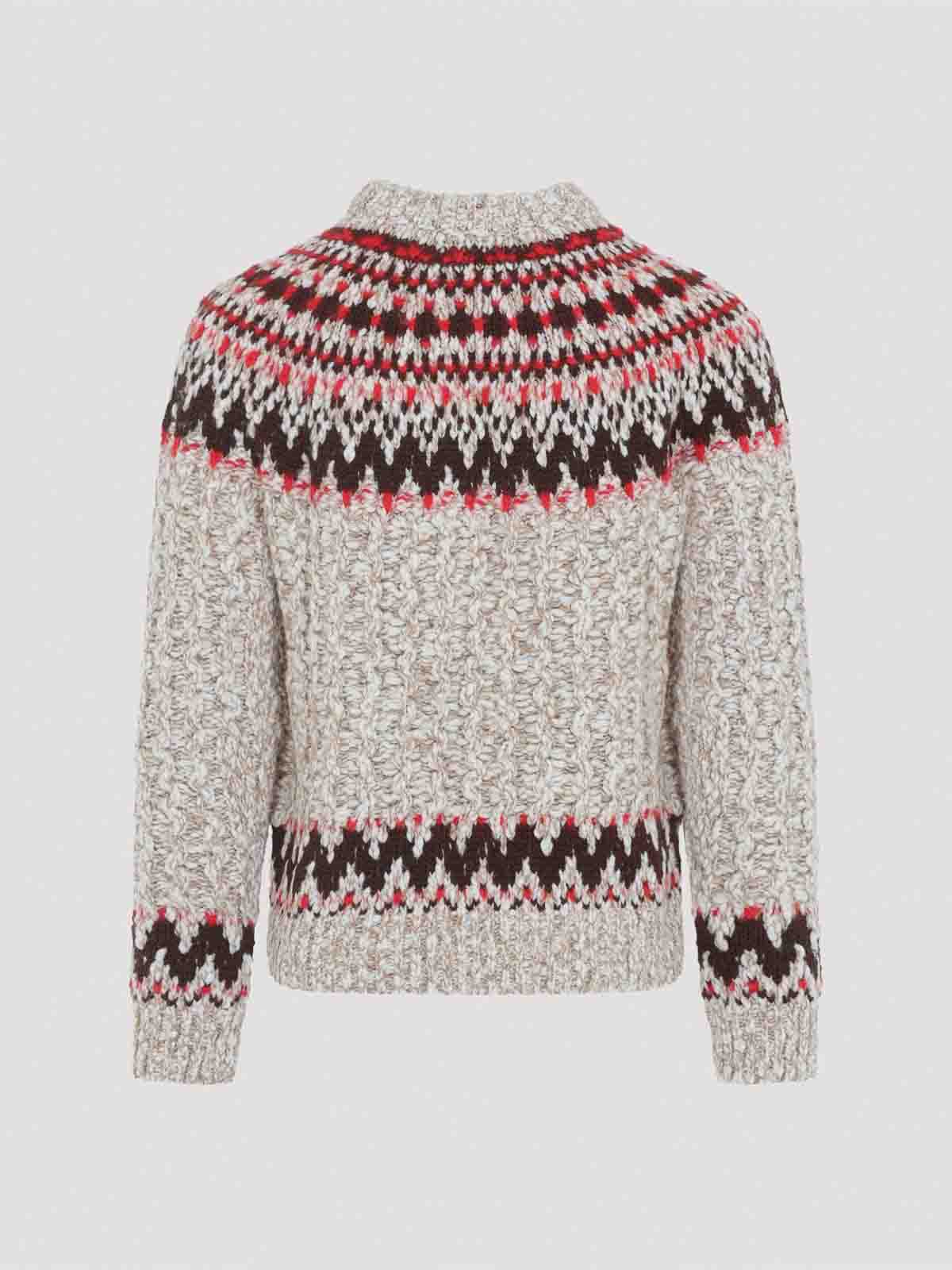 Moncler Grenoble Rundhalsausschnitt aus hellbeiger Schurwolle. gefertigt aus Schurwolle, Polyamid, Seide und Elasthan. gerippter Rundhalsausschnitt, lange Ärmel, gerippte Bündchen und Saum, gerader Saum, Strickdesign. braunes und rotes geometrisches Design.