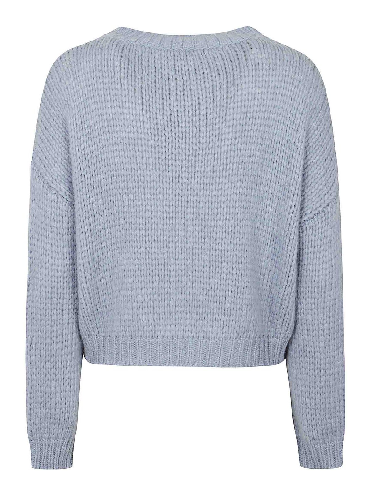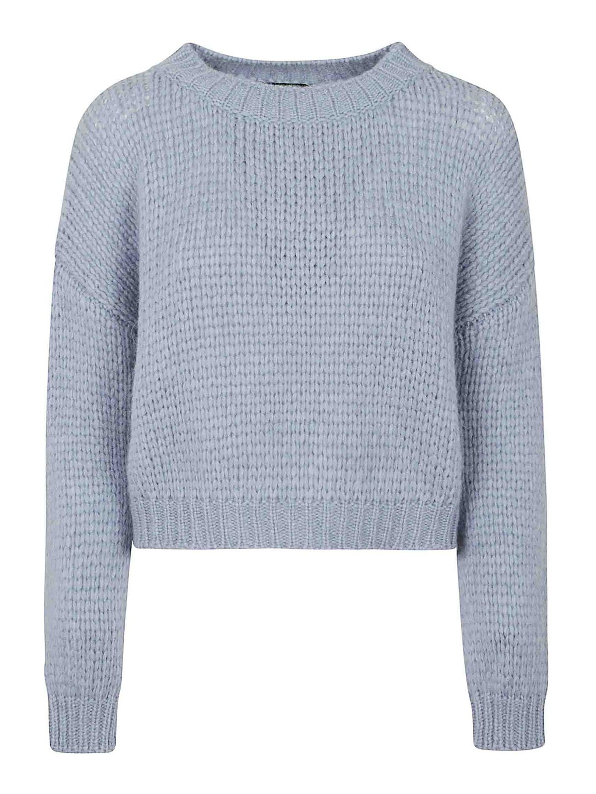 Hellblauer Pullover aus Alpakawolle, Rundhalsausschnitt, Boxy-Passform, Kragen mit Saumkante und Rippbündchen.
