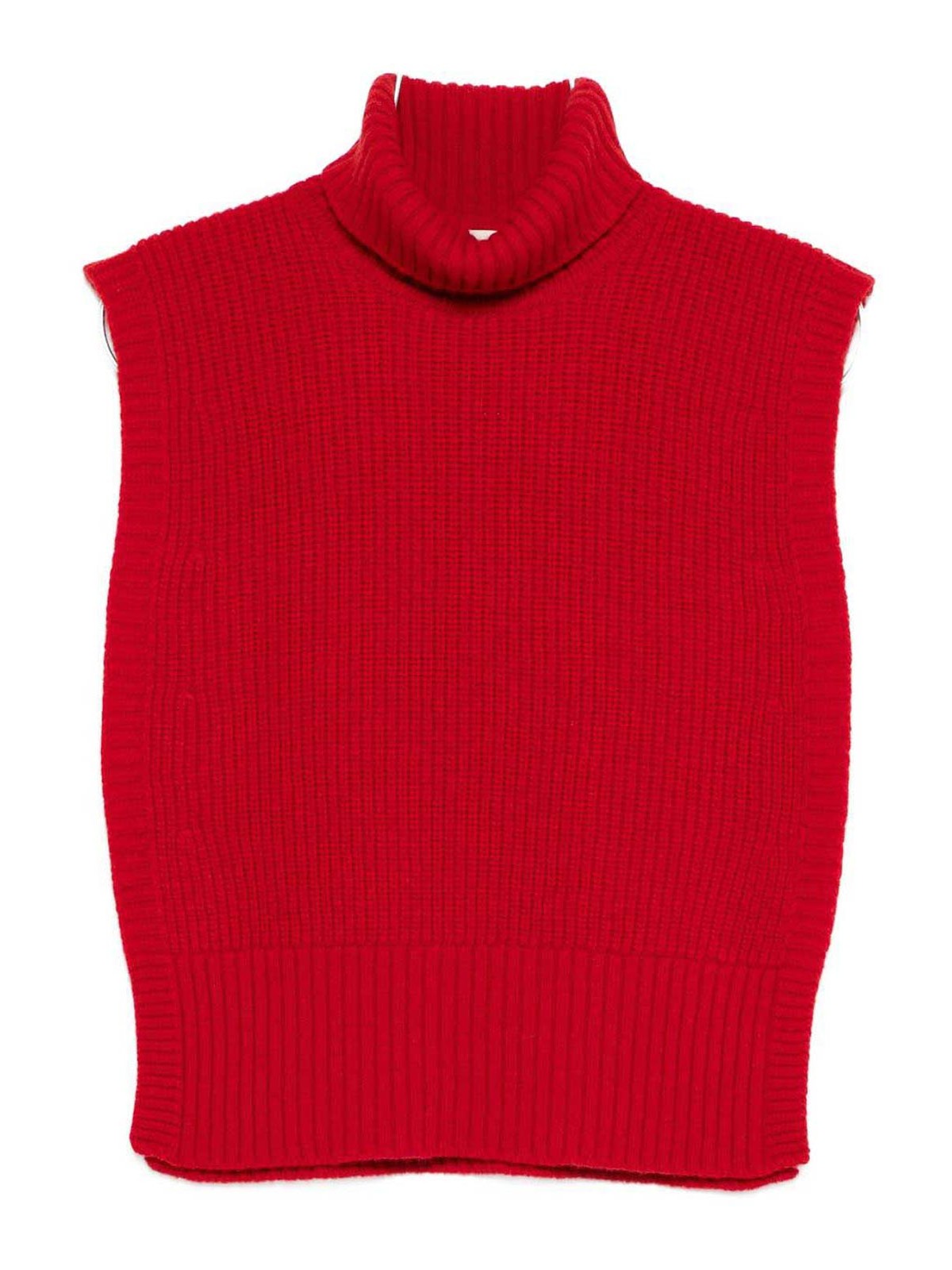 Roter Rollkragenausschnitt, ärmelloser Rippstrick, kurze Länge