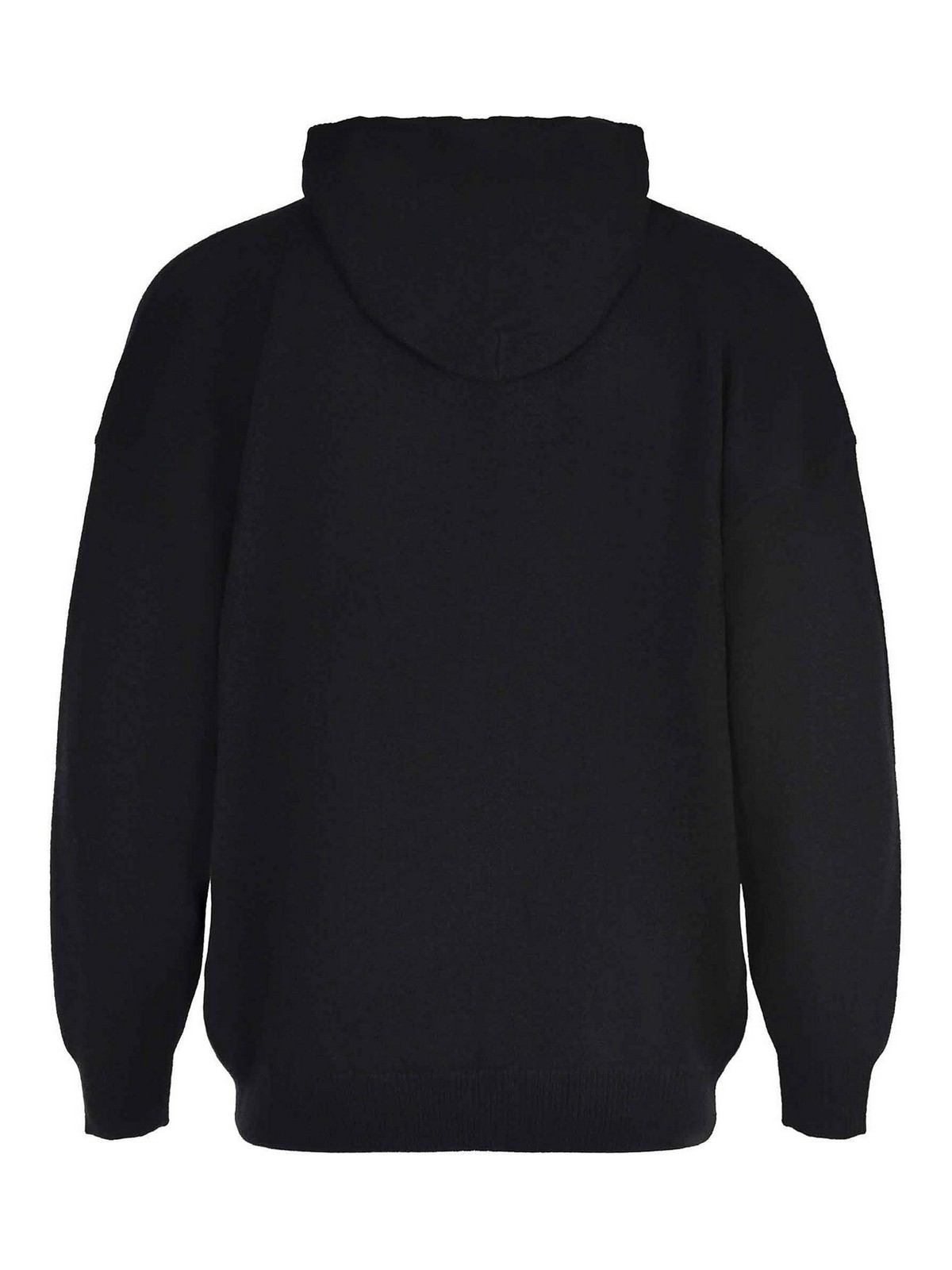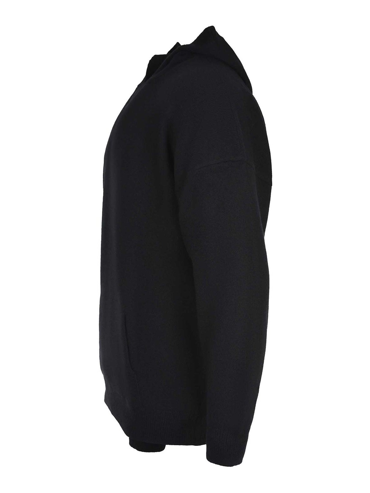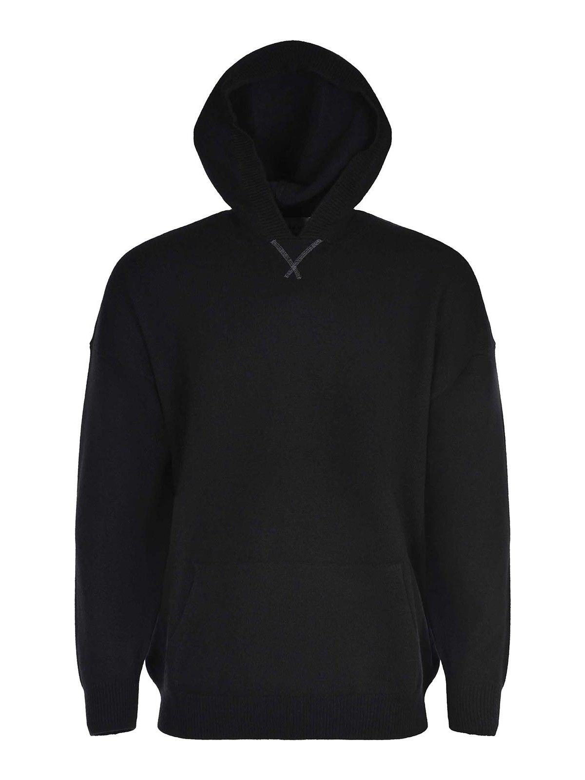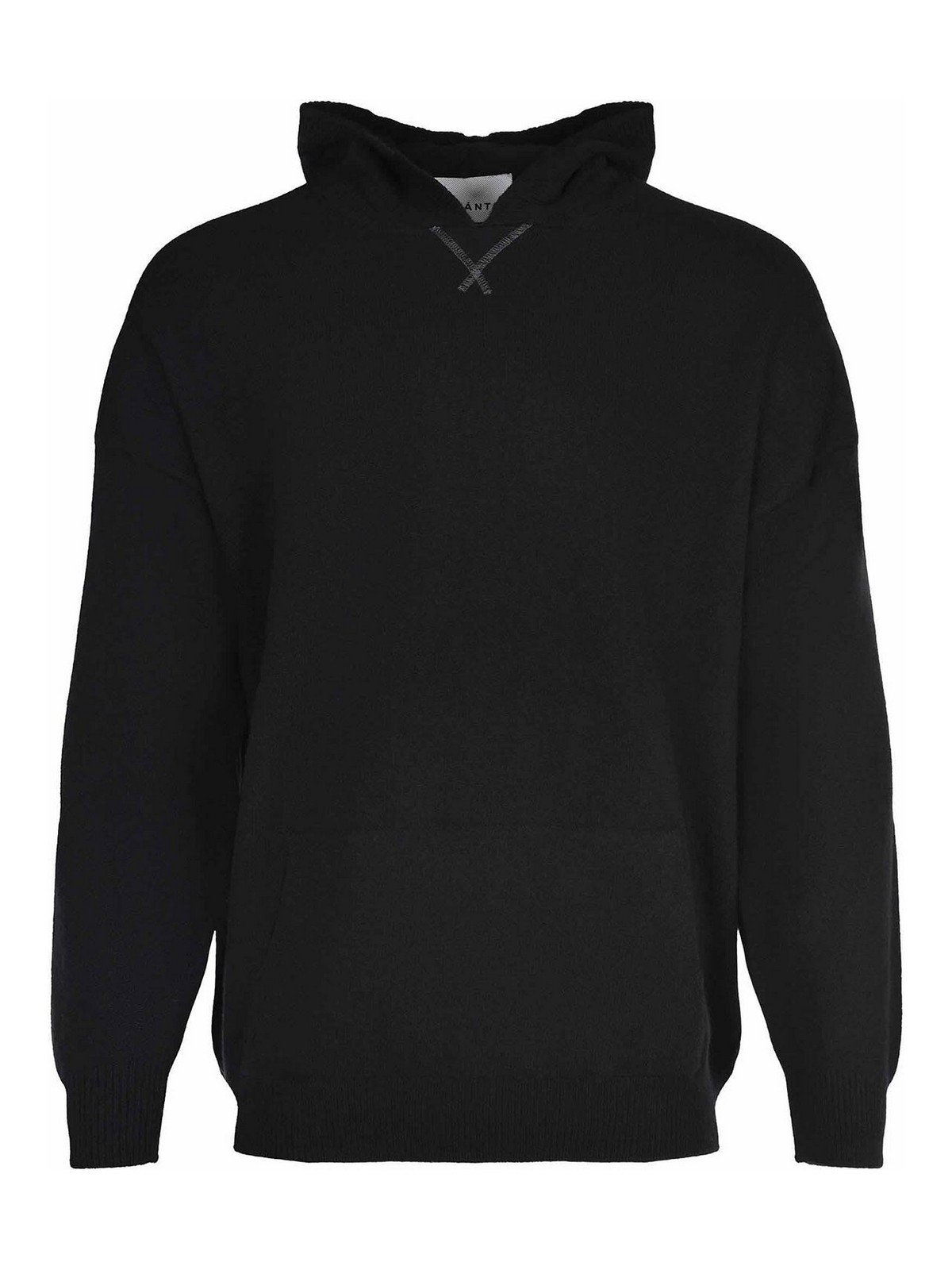 Amaranto-Pullover aus schwarzer Wolle, Kapuze, lange Ärmel, gerippte Manschetten und Saum, Kängurutasche auf der Vorderseite, 100% Wolle, hergestellt in Italien