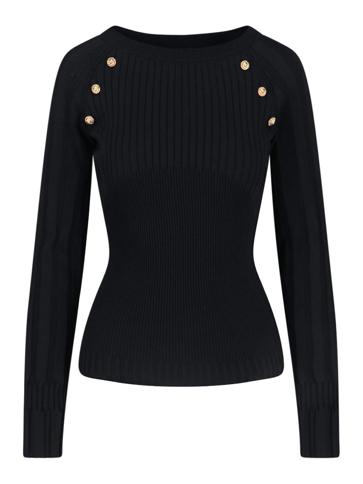 Balmain-Pullover mit Knöpfen, schwarz, Rippstrick, U-Boot-Ausschnitt, lange Ärmel, goldene Metallknöpfe auf der Vorderseite, gerader Saum.