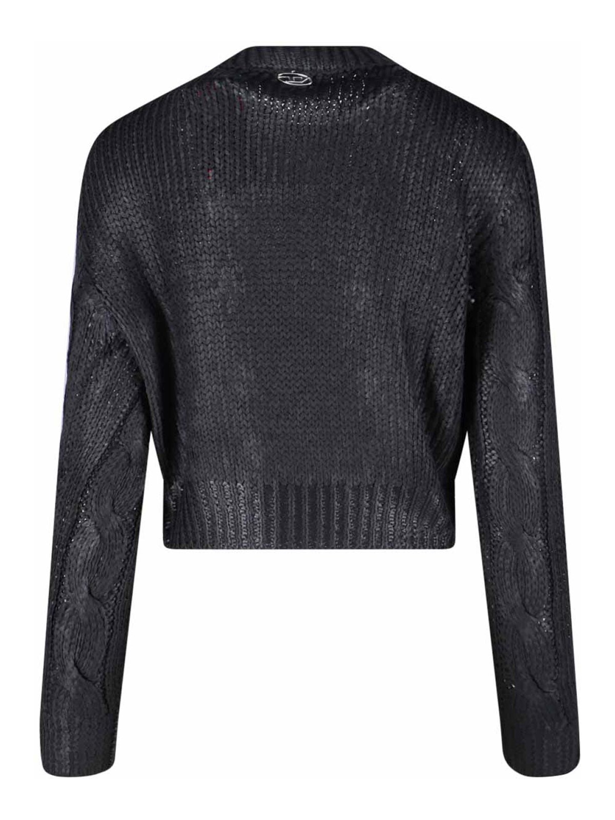 Diesel Miccha Crop-Pullover aus schwarzem Stoff, Zopfmuster, Rundhalsausschnitt, metallischer Logo-Anhänger auf der Rückseite, gerader Saum.