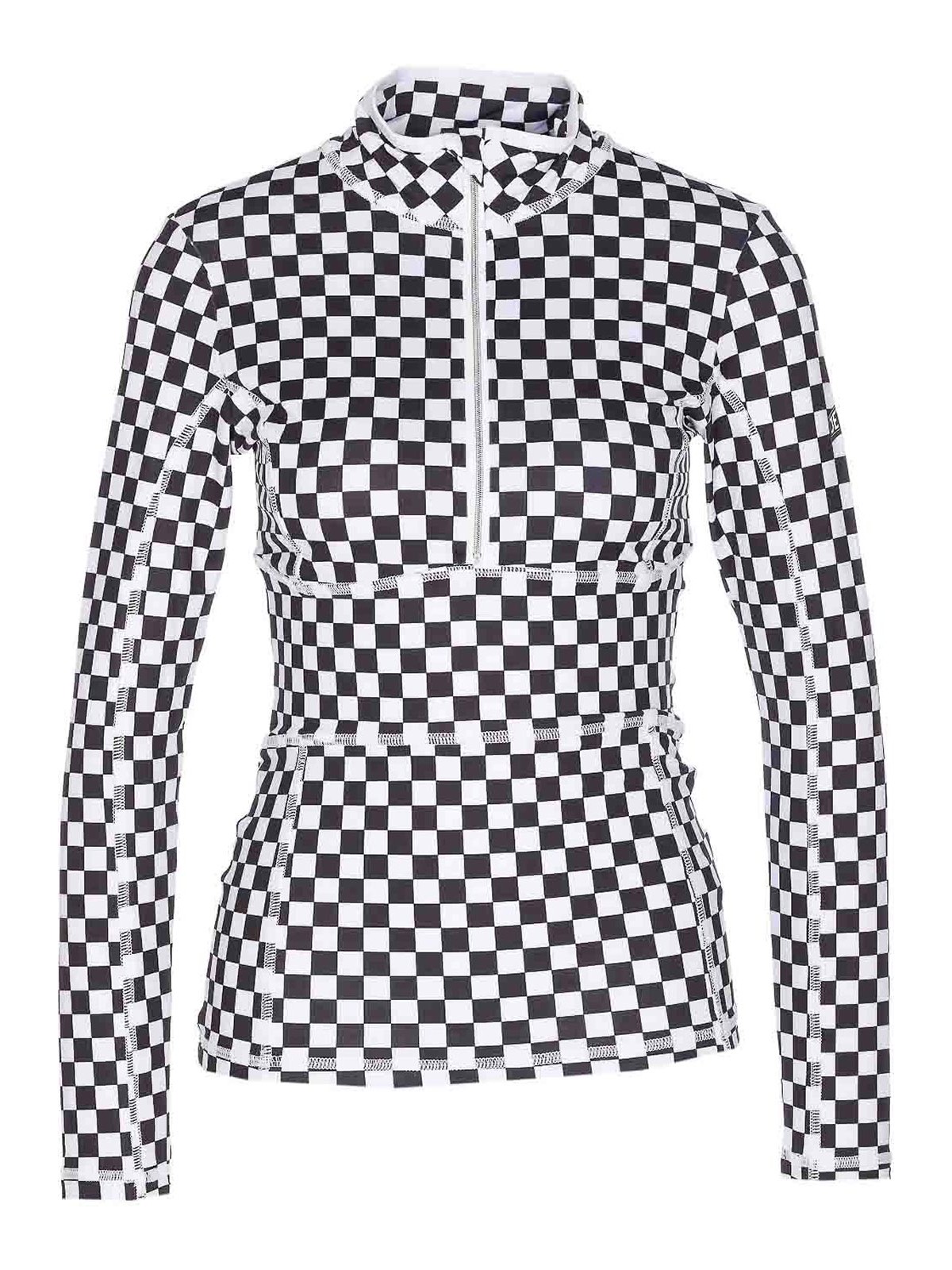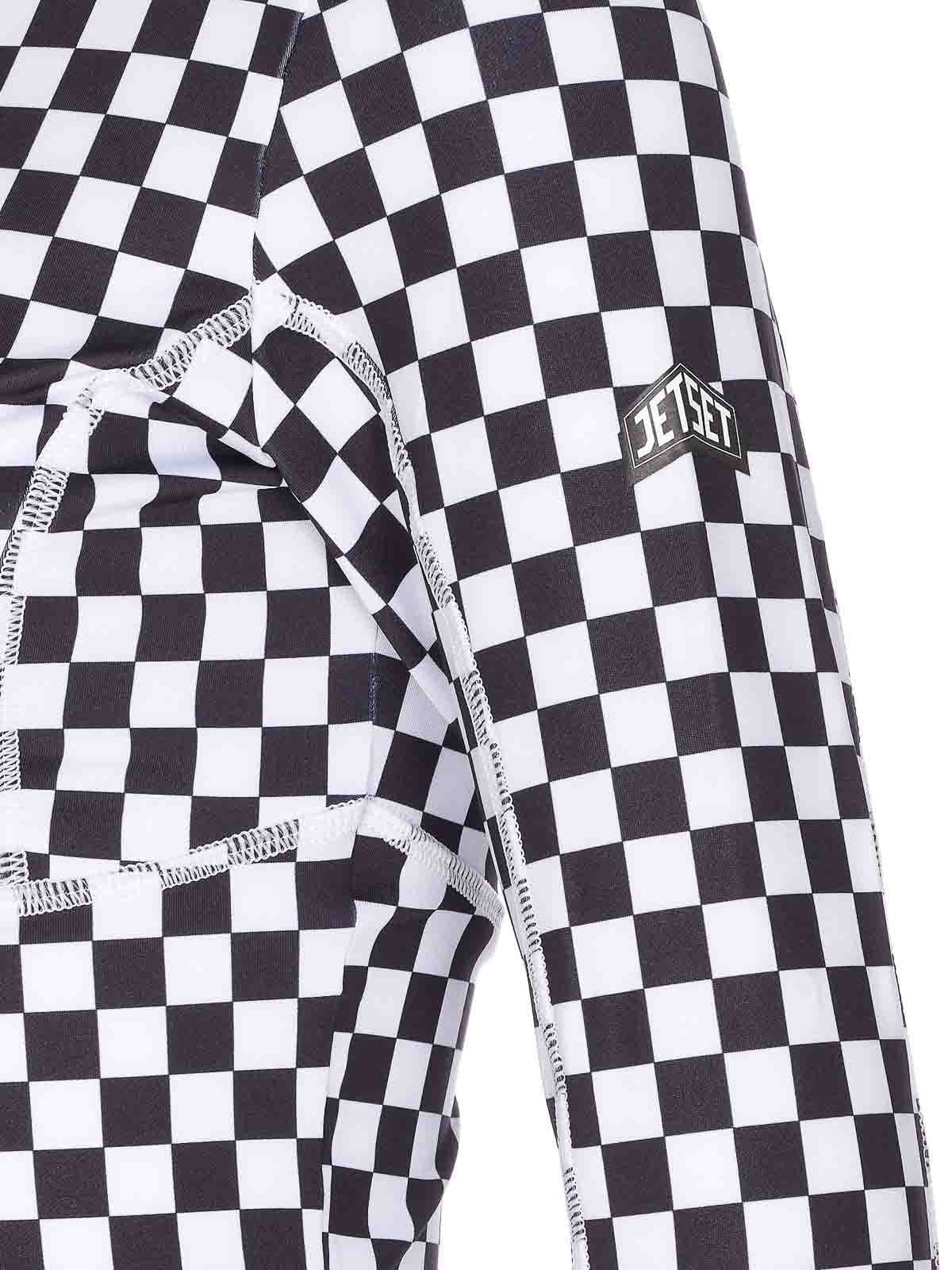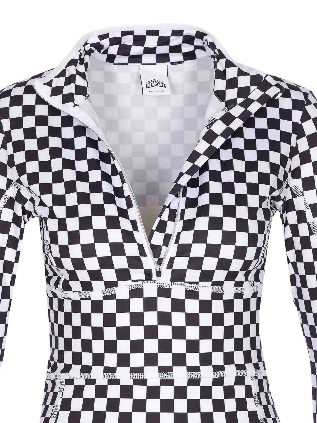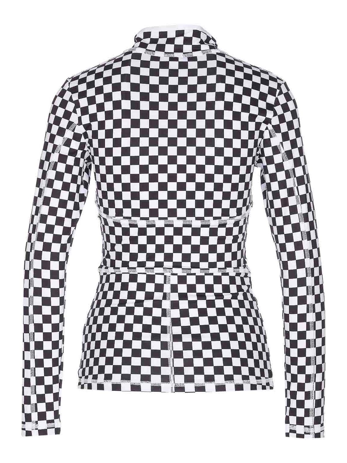 Jetset-Oberteil in Schwarz, Weiß, Ingwer, Rundhalsausschnitt, Reißverschluss auf der Rückseite, lange Ärmel, Karomuster, elastische Passform