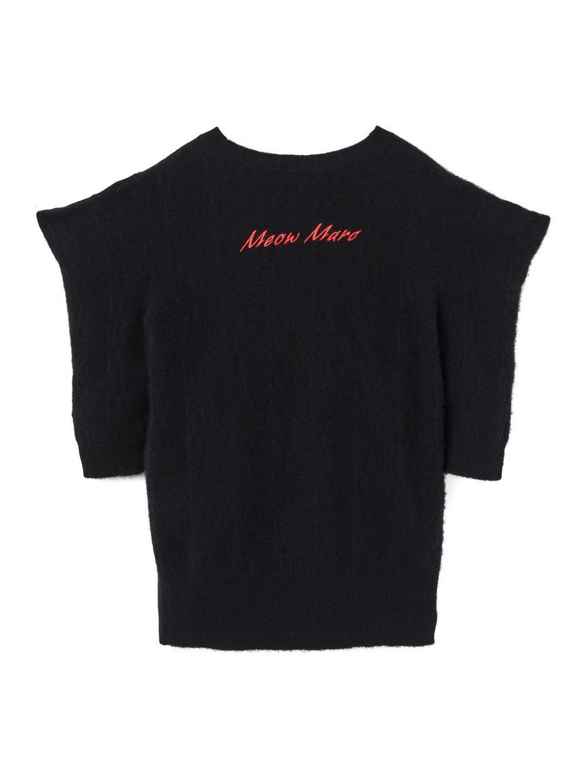 Schwarzer Intarsienstrick in gebürsteter Optik, gesticktes Logo auf dem gerippten Rand, bestickter Slogan, Rundhalsausschnitt, eingeklemmte Schultern, halbe, lange Ärmel