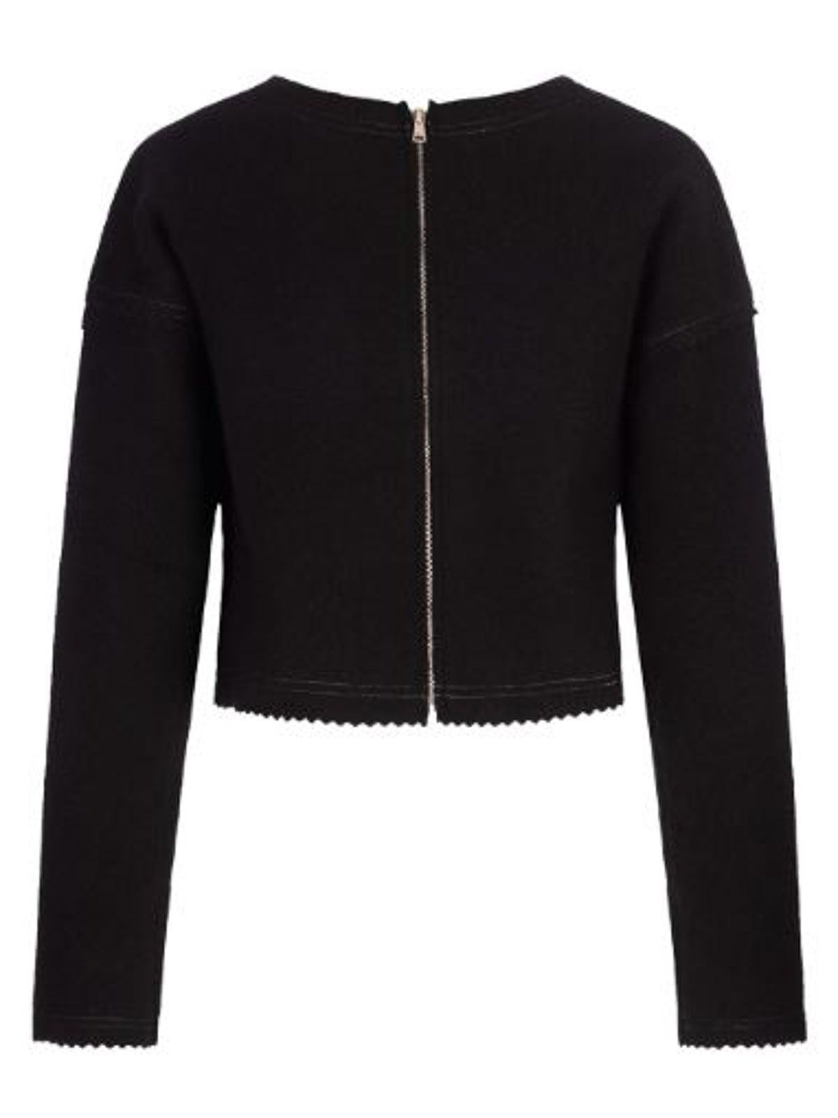 Schwarzer Crespo-Crop-Pullover von Max Mara Garn, gearbeitet in einem gefilzten Effekt, Modell mit Rundhalsausschnitt, langem, tief angesetztem Schnitt, in den Ärmeln mit Laser, geschnittenen Zickzackprofilen und kontrastfarbenen Nähten am Rücken