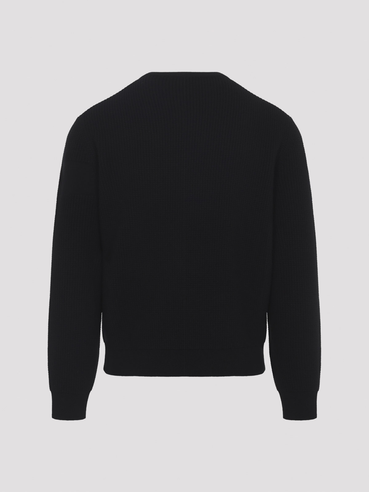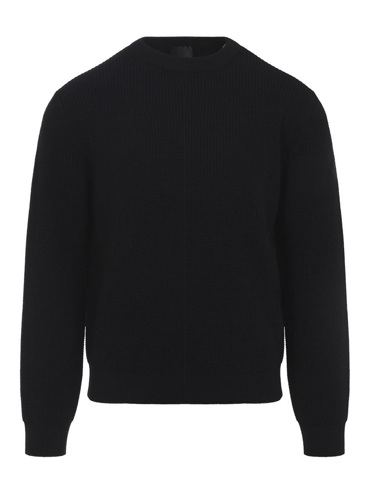 Schwarzer Pullover aus Schurwolle von Moncler. Hergestellt aus schwarzer gestrickter Schurwolle, mit Rundhalsausschnitt, langen Ärmeln, farblich abgestimmtem Gummi-Logo-Patch am Ärmel, gerippten Kanten und geradem Saum.