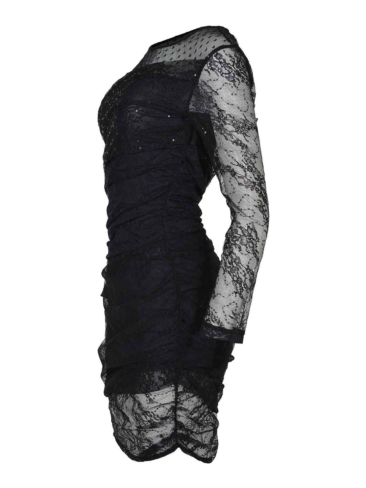Pinko Backgammonkleid aus schwarzer Spitze, Rundhalsausschnitt, lange Ärmel, Patchwork-Effekt, seitlich drapiert, Ton in Ton gestickte Mikro-Pailletten, gefüttert, 89% Nylon, 11% Elastan.