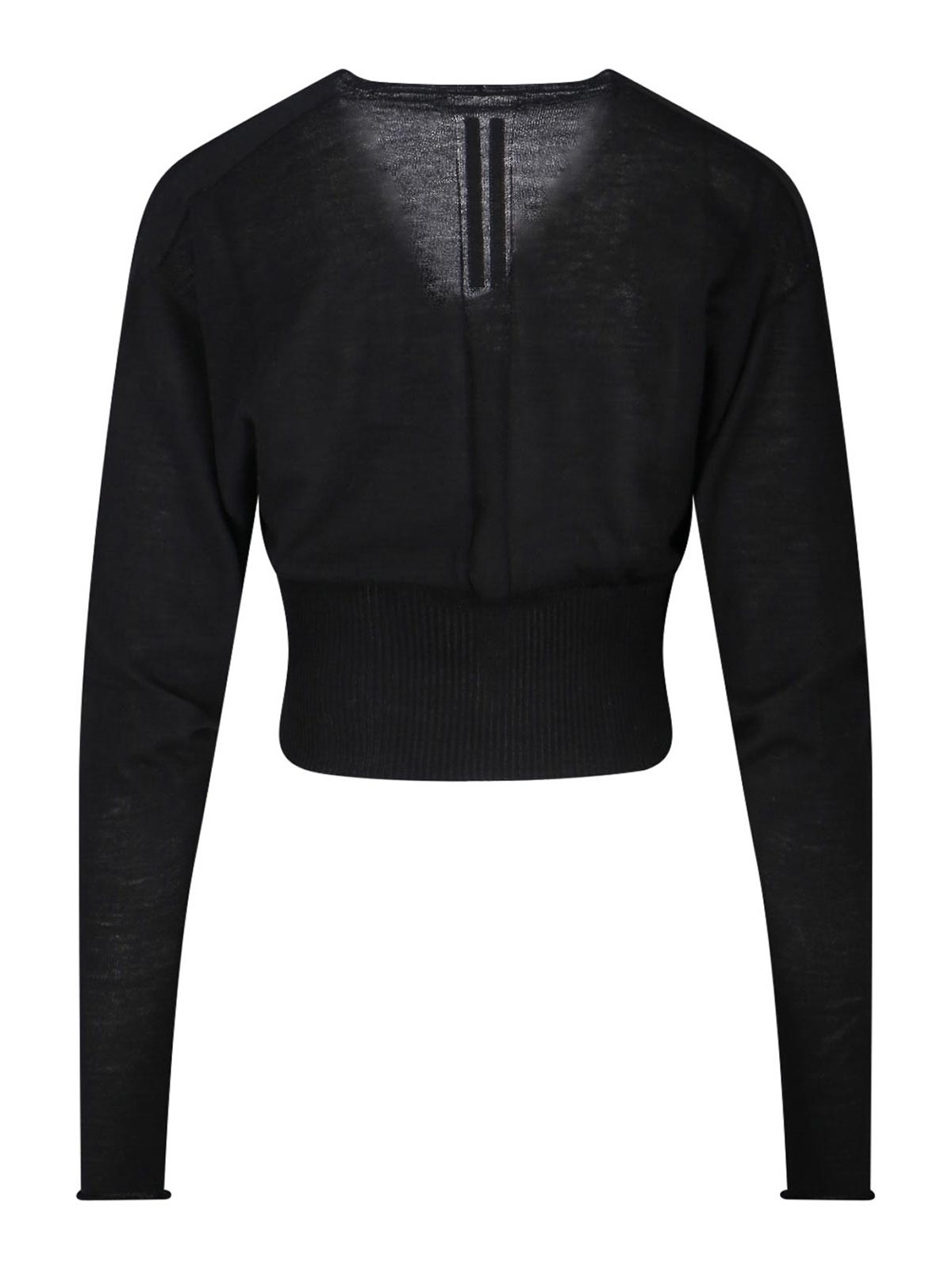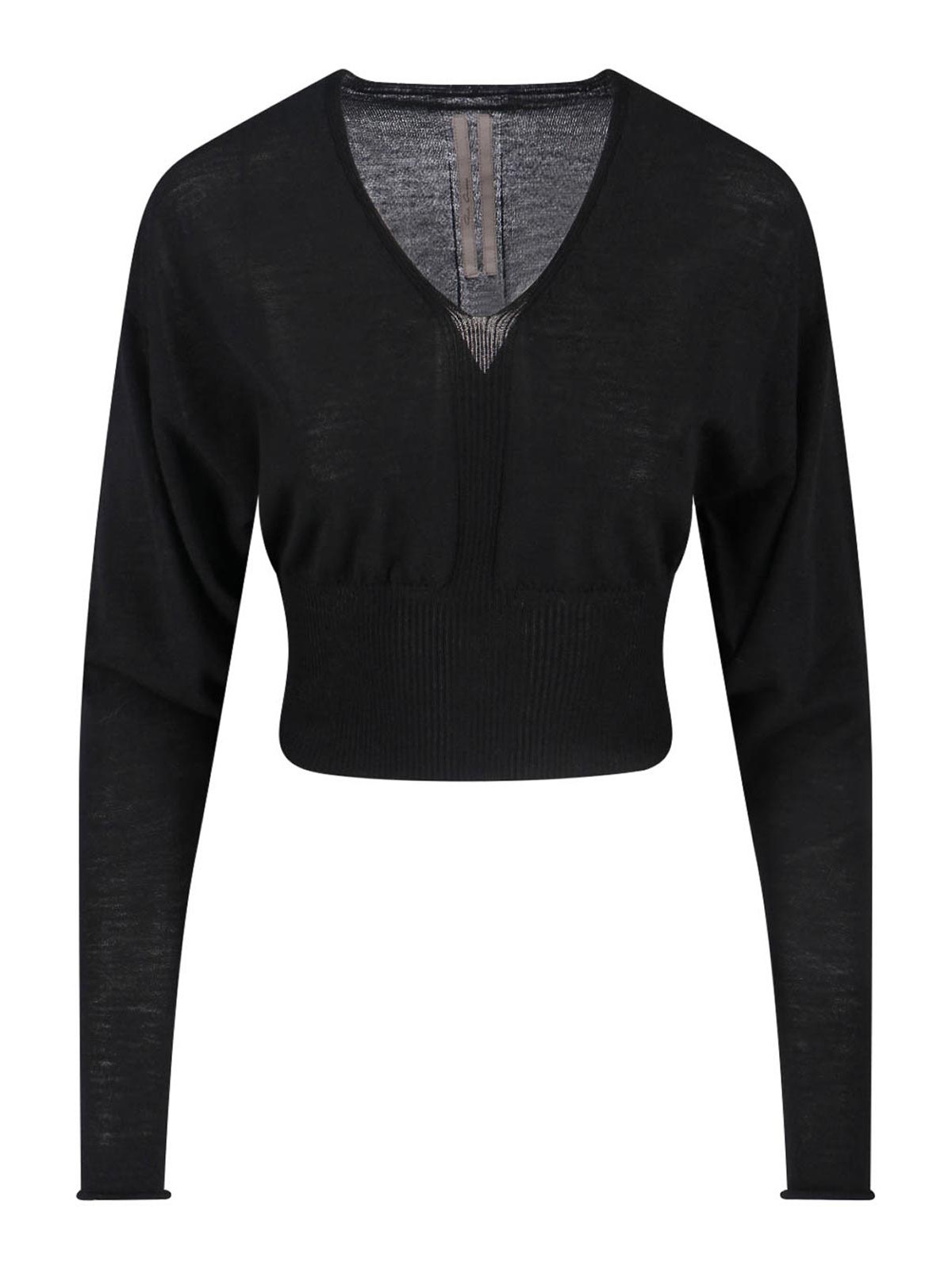 Kurzer Pullover aus Rick Owens Wolle, schwarz, V-Ausschnitt, elastische Rippabschlüsse, gerader Saum.