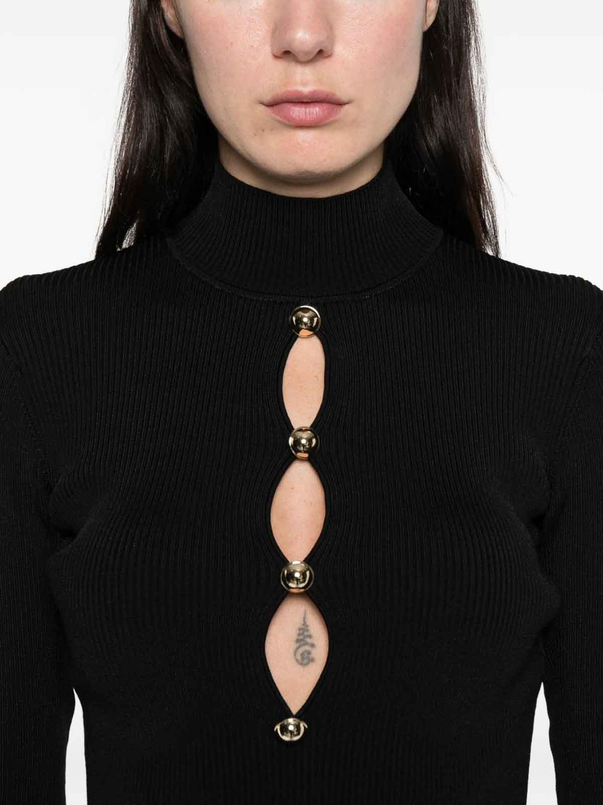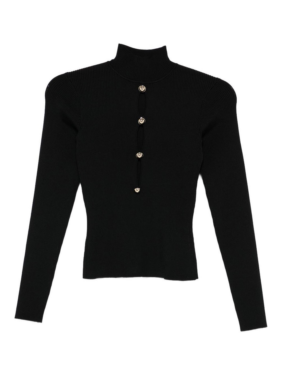 Schwarzer Stehkragen aus Rippstrick mit langen, farbigen Knöpfen