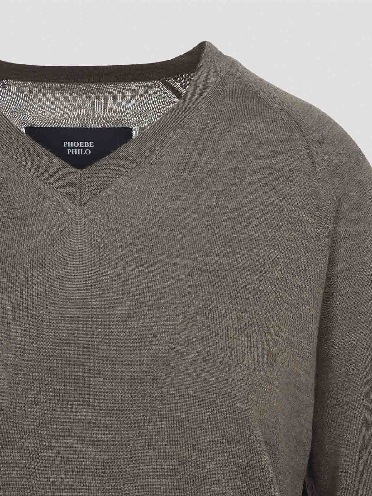 Phoebe Philo Shrunk V, Ausschnitt, brauner Pullover, gefertigt aus braunem feinem V, Ausschnitt, lange Ärmel, gerippter Kragen, Manschetten und Saum
