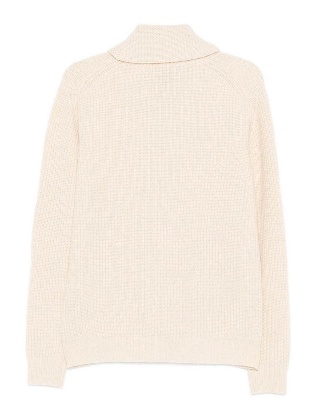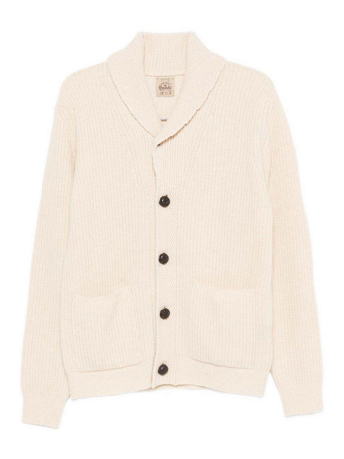 Hellbeiger Schalkragen, gerippter Strick auf der Vorderseite, Knopfverschluss, aufgesetzte Taschen, lange Ärmel