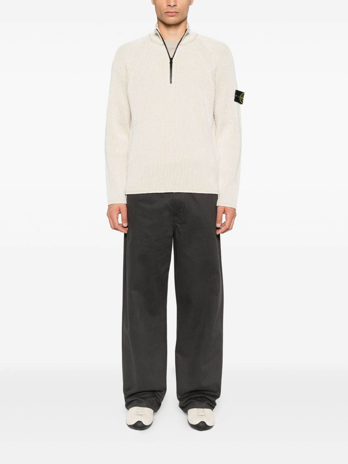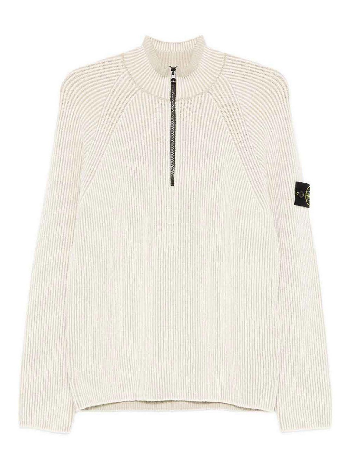 Elfenbeinfarbener Rippstrick, Raglanärmel, halber Reißverschluss, Logo-Patch, gerader Saum