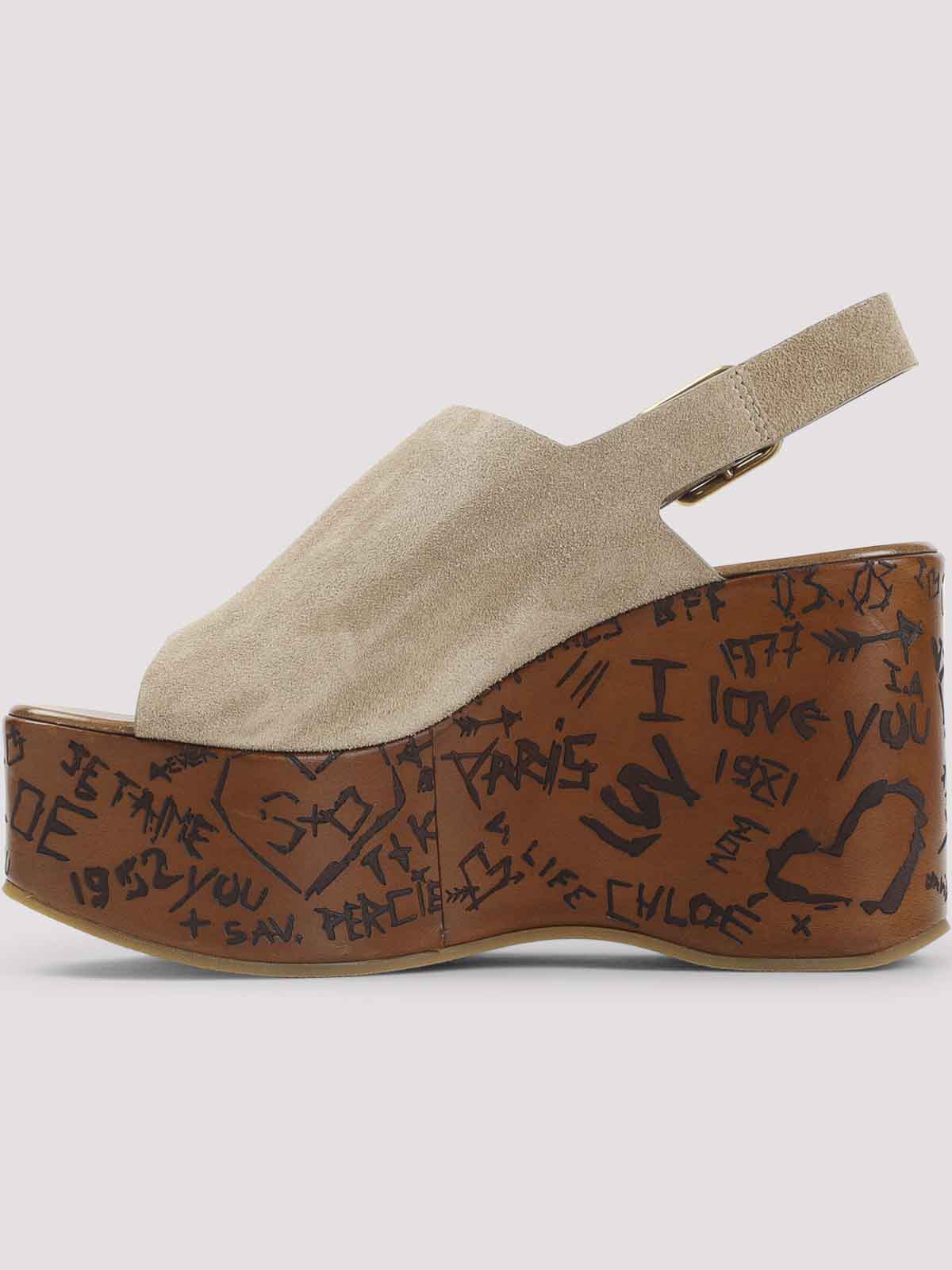 Chloe Maxime Wedges Sandalen aus Veloursleder in Sandbeige. sandbeige Sandale aus Veloursleder aus Kalbsleder in Desert Sand, offene und runde Spitze, tonaler Riemen an der Oberseite, verstellbarer Knöchelriemen, brauner TPU-Keil mit kontrastierendem schwarzem Logo-Schriftzug.