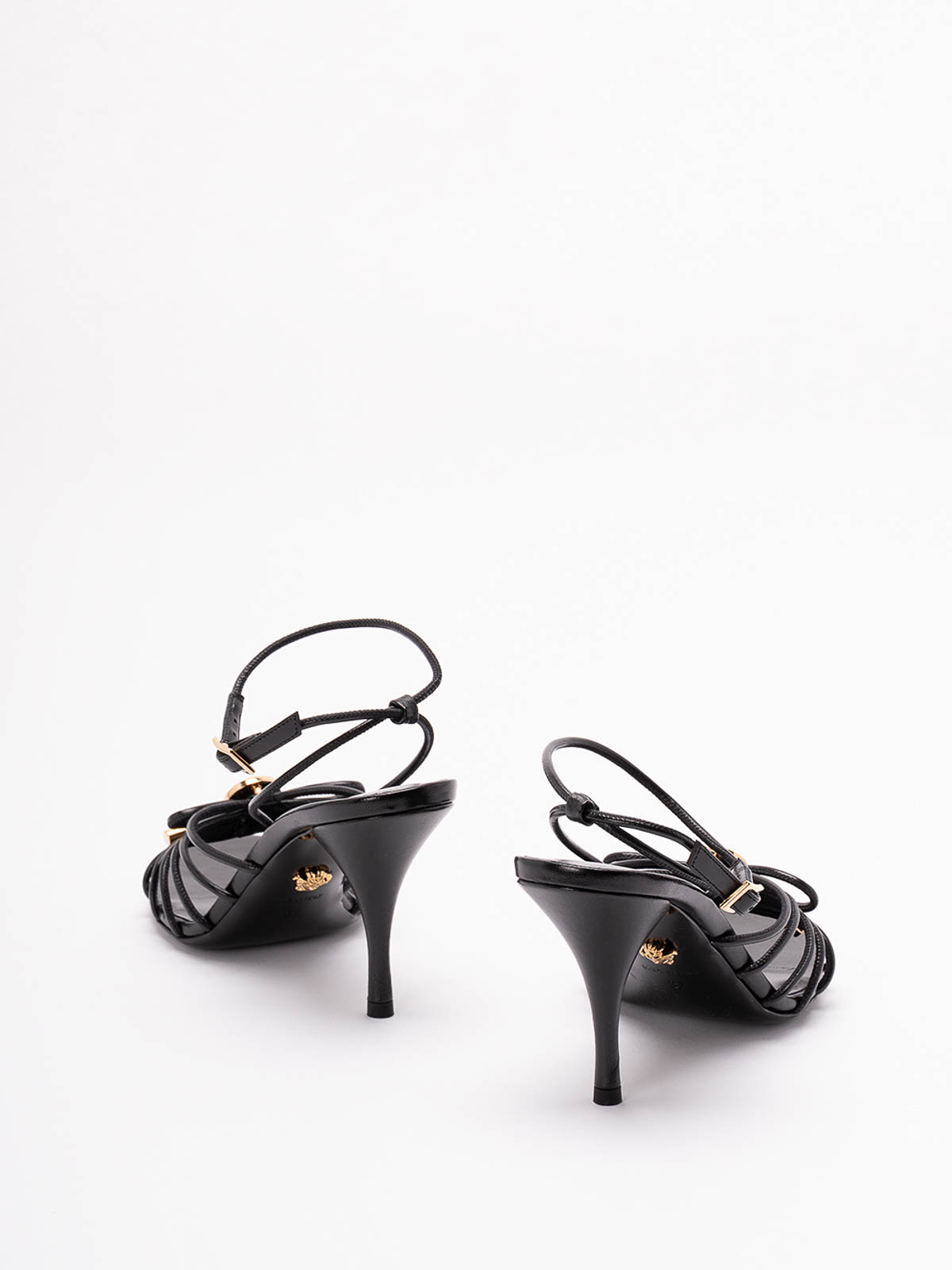 Damensandalen aus hochwertigem Leder, die sich durch ein ikonisches Design und goldene Metalldetails auszeichnen, die an die unverwechselbare Ästhetik der Maison erinnern. Die schwarze Farbe mit Versace Gold-Oberflächen macht das Modell elegant und entscheidend und eignet sich ideal, um raffinierte Looks zu vervollständigen.