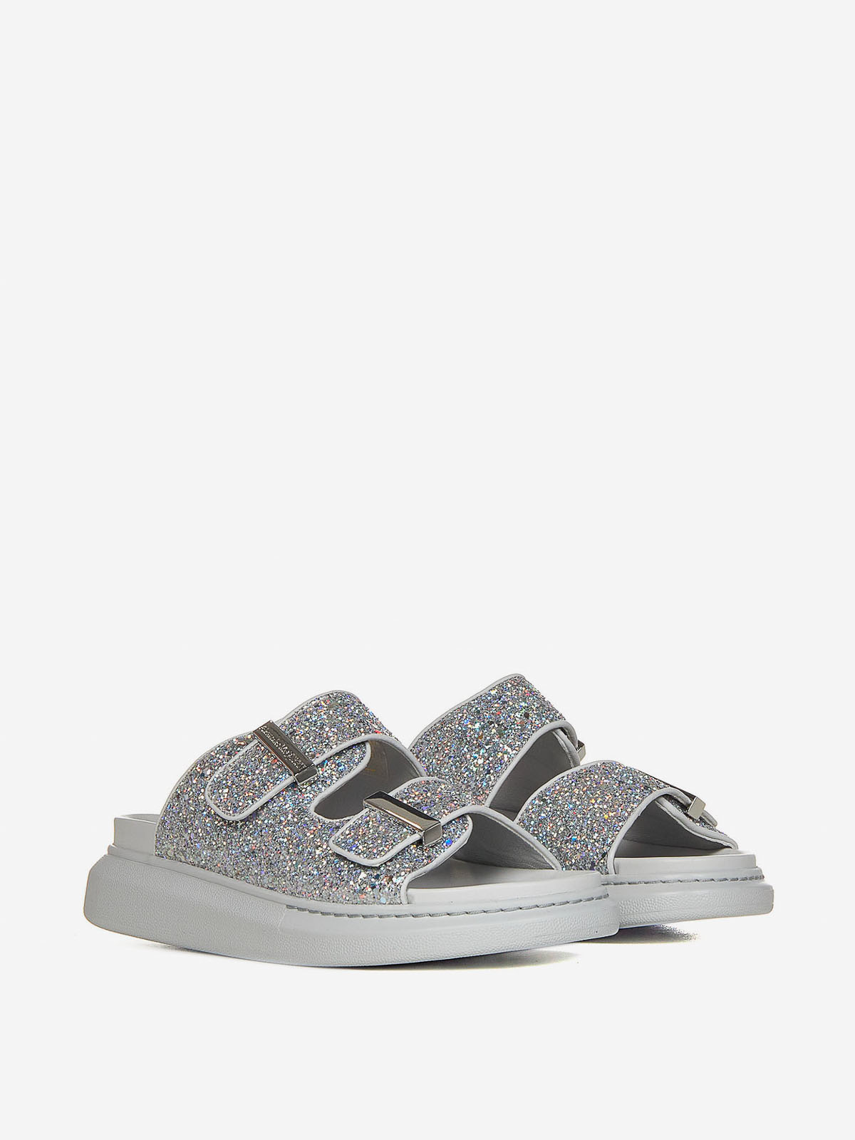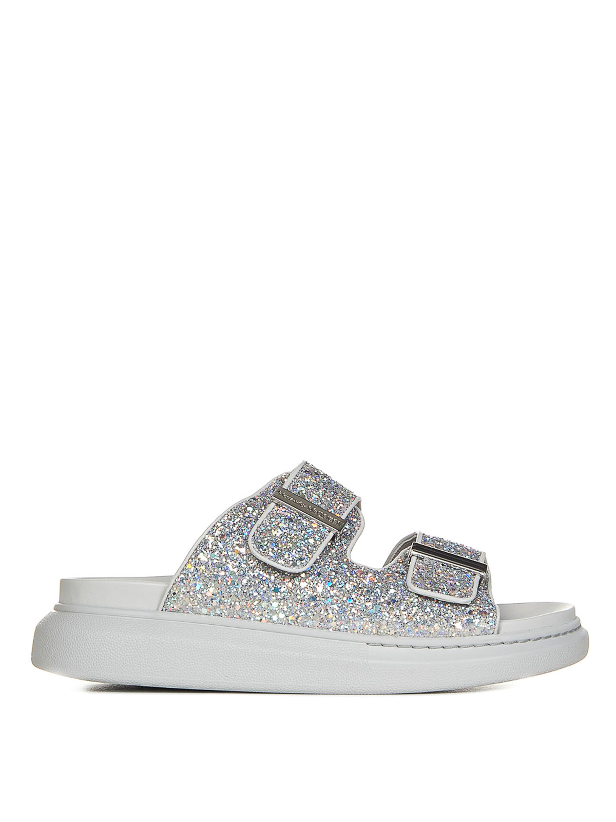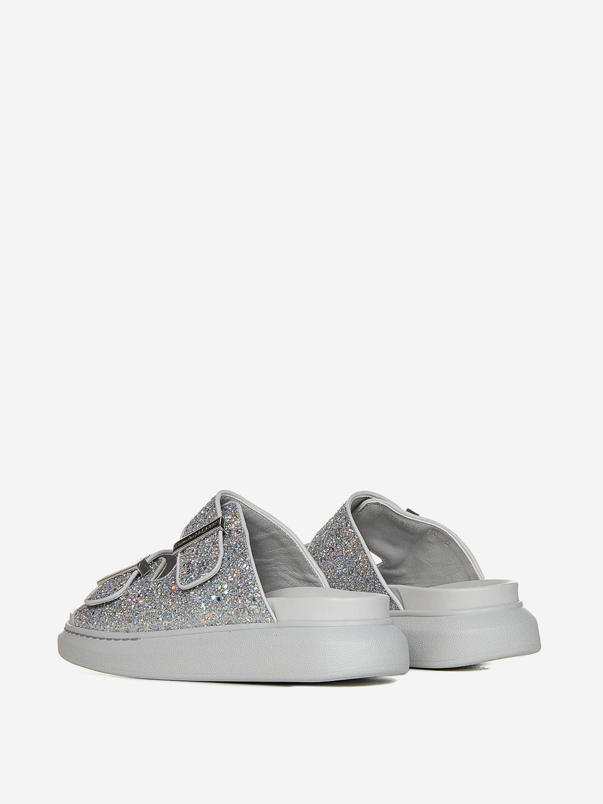 Design ohne Verschluss: runder offener Zehenbereich, Glitzer auf dem Obermaterial aus Doppelband mit silberner Metallschnalle, hohe Schnalle mit eingraviertem Logo innen, Innensohle und Gummisohle, übergroße Sohle mit Ledereinsatz silber
