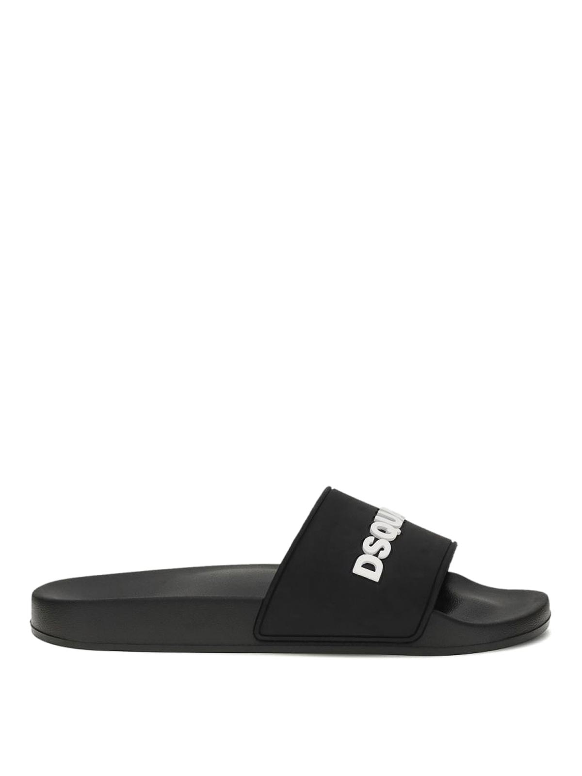 Schwarze Logo-Slipper von dsquared2, hergestellt in Italien, mit modernem und minimalistischem Design. Slip-On-Stil mit offener Spitze, flacher Sohle und Logo-Detail machen sie perfekt für trendige, lässige Sommeroutfits.