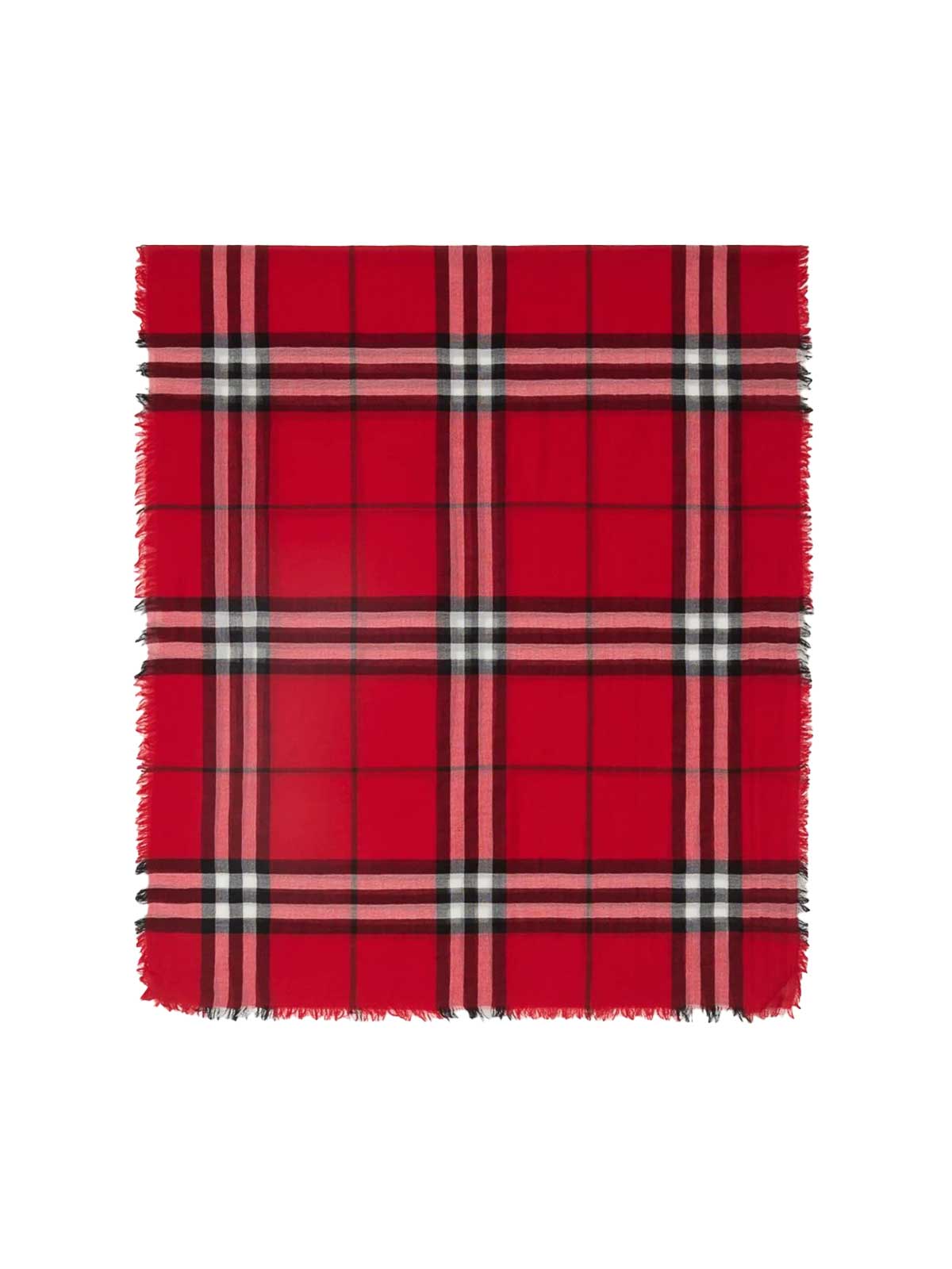Burberry-Wollschal mit Karomuster, rot, Retro-Logo-Etikett, Fransen an der Unterseite, rechteckige Form.