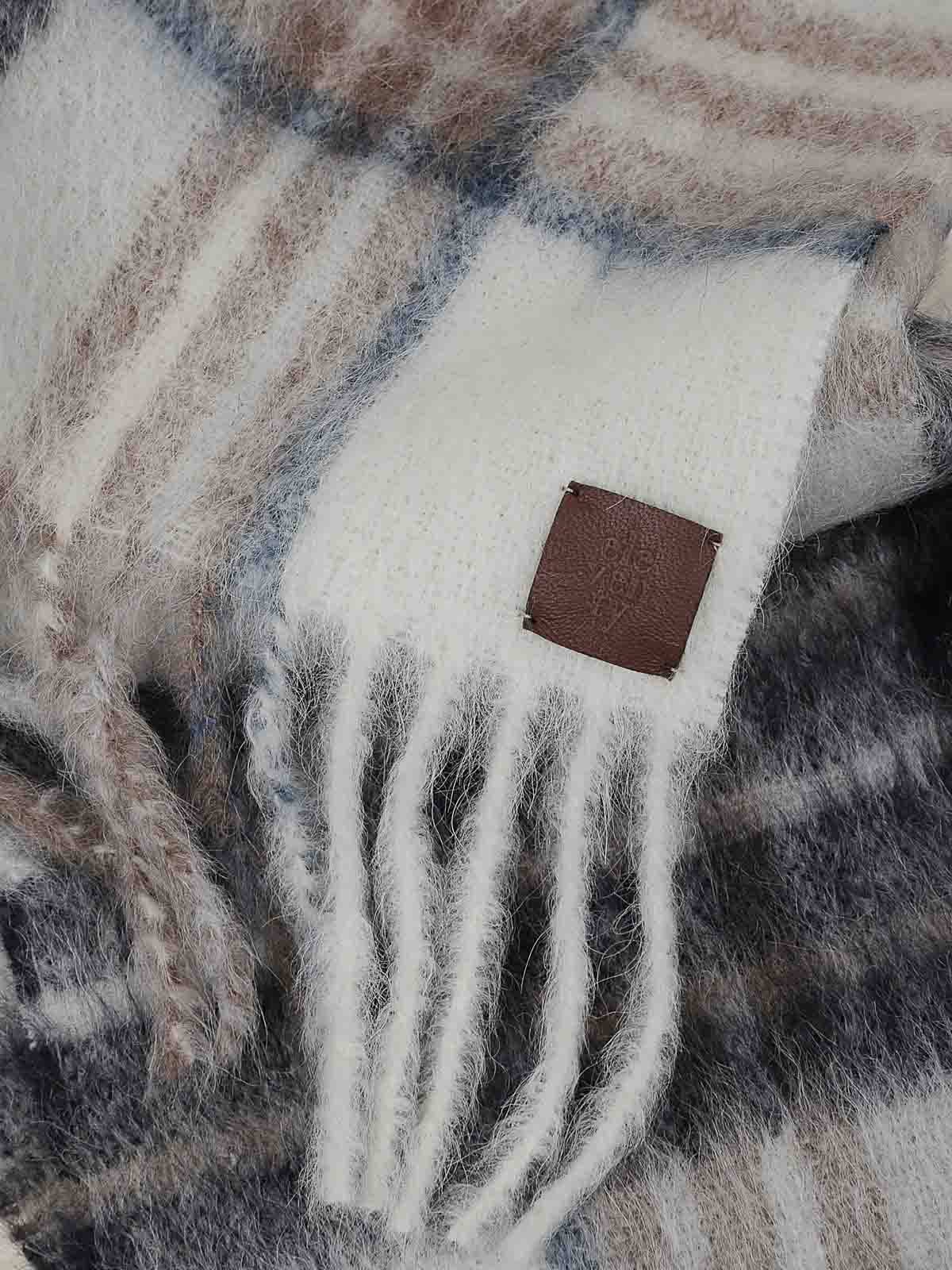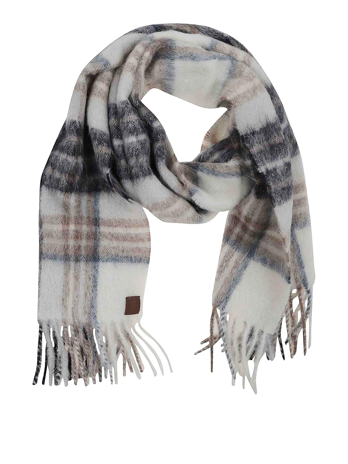 Schal aus Alpaka- und Wollmischung von Eleventy, buntes Karomuster, Fransensaum. Mit einem Logo-Etikett aus Leder.
