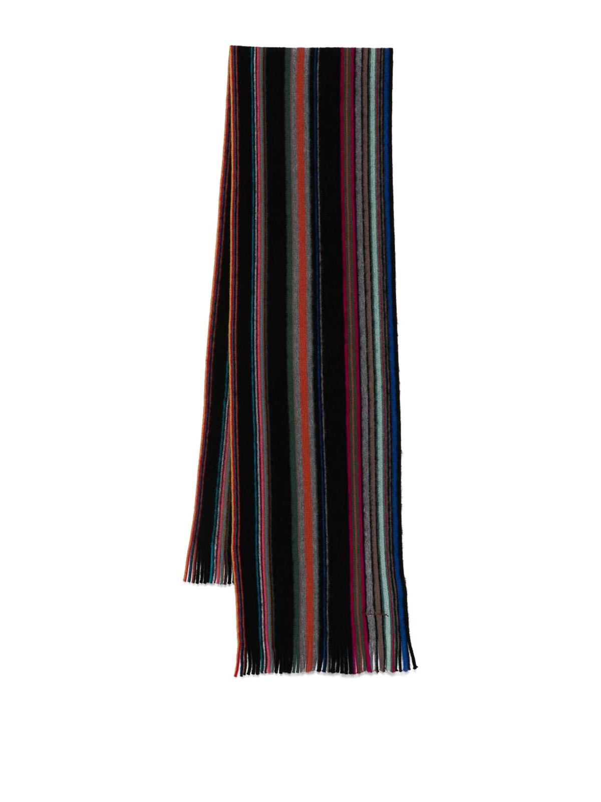 Schwarz/mehrfarbiger Rippstrick, vertikales Streifenmuster, Fransenkante, rechteckige Form, Wickelstil