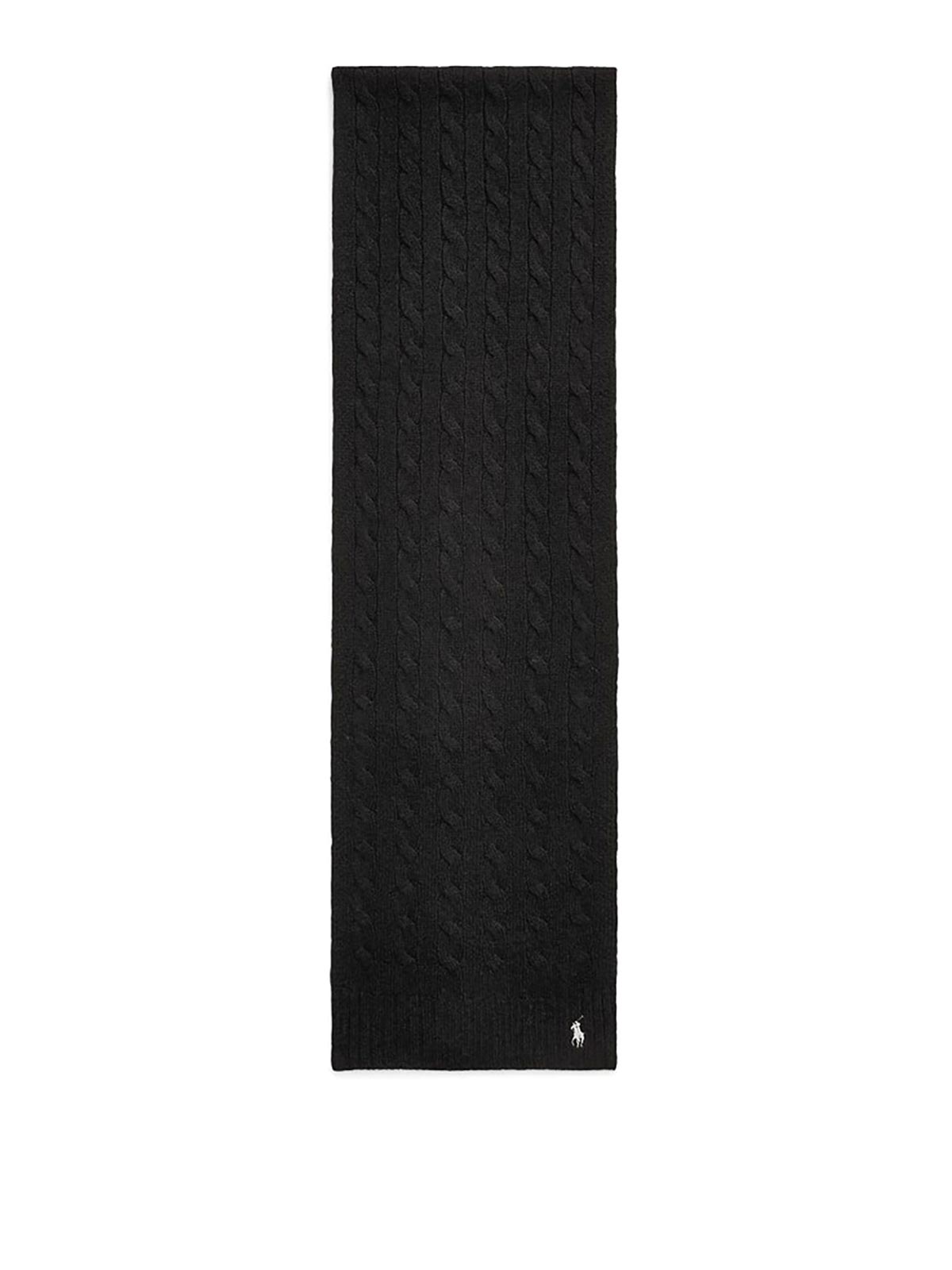 Der aus einer luxuriösen Mischung aus Wolle und Kaschmir gefertigte Schal ist mit Ralph Laurens charakteristischem Zopfmuster versehen und mit gestickten Pony-Details verziert.
