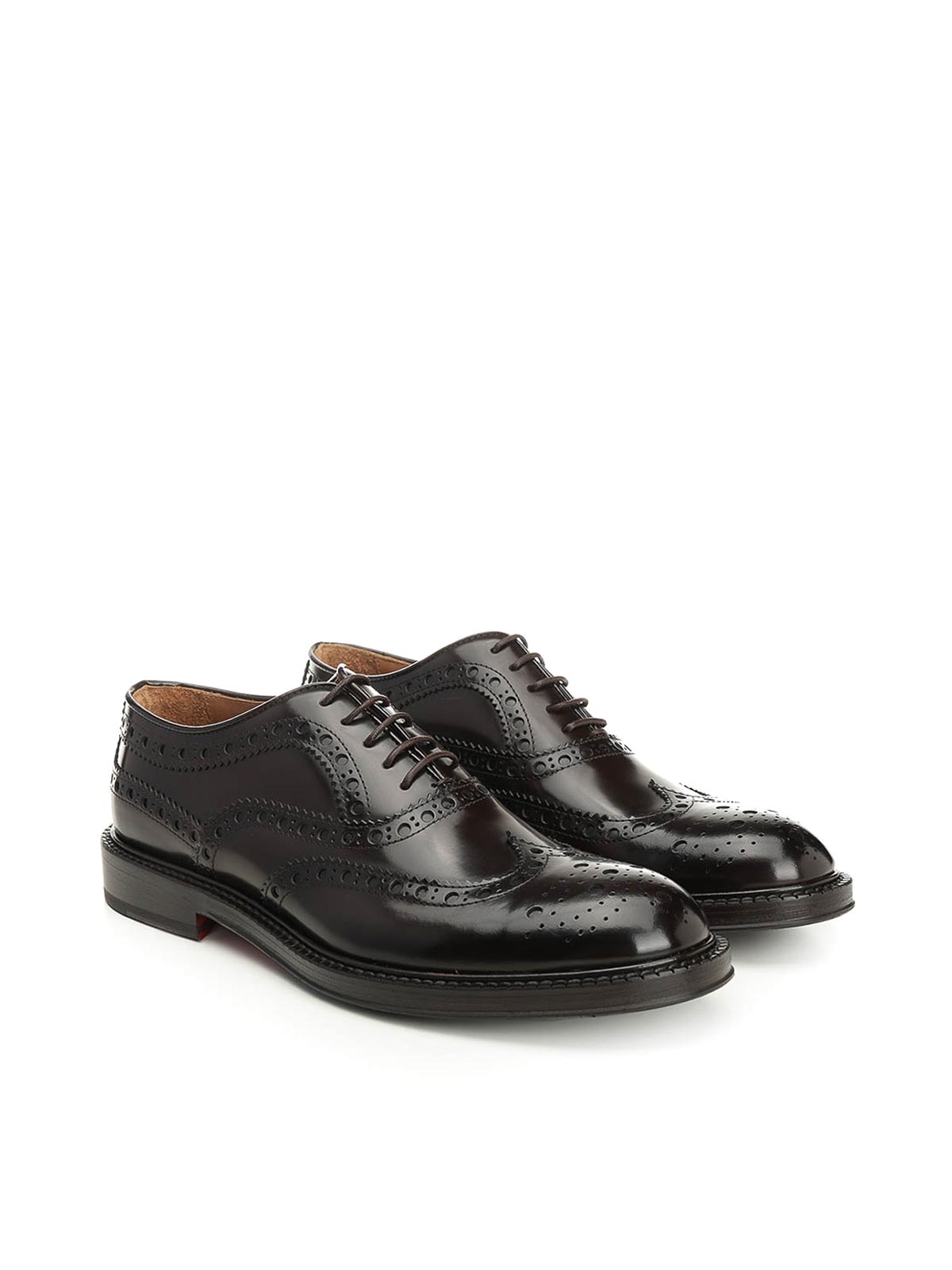 Klassische Brogue-Konstruktion mit dekorativen Perforationen und Schwalbenschwanzspitze. Ledersohle mit Gummieinsatz. Schnürverschluss.
