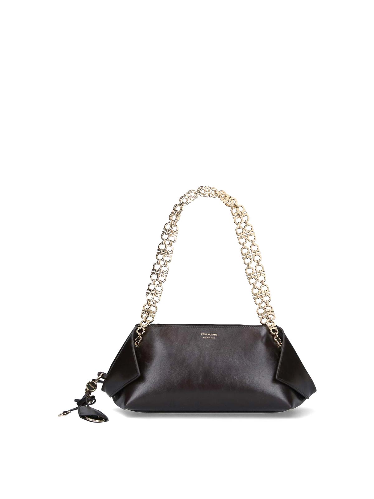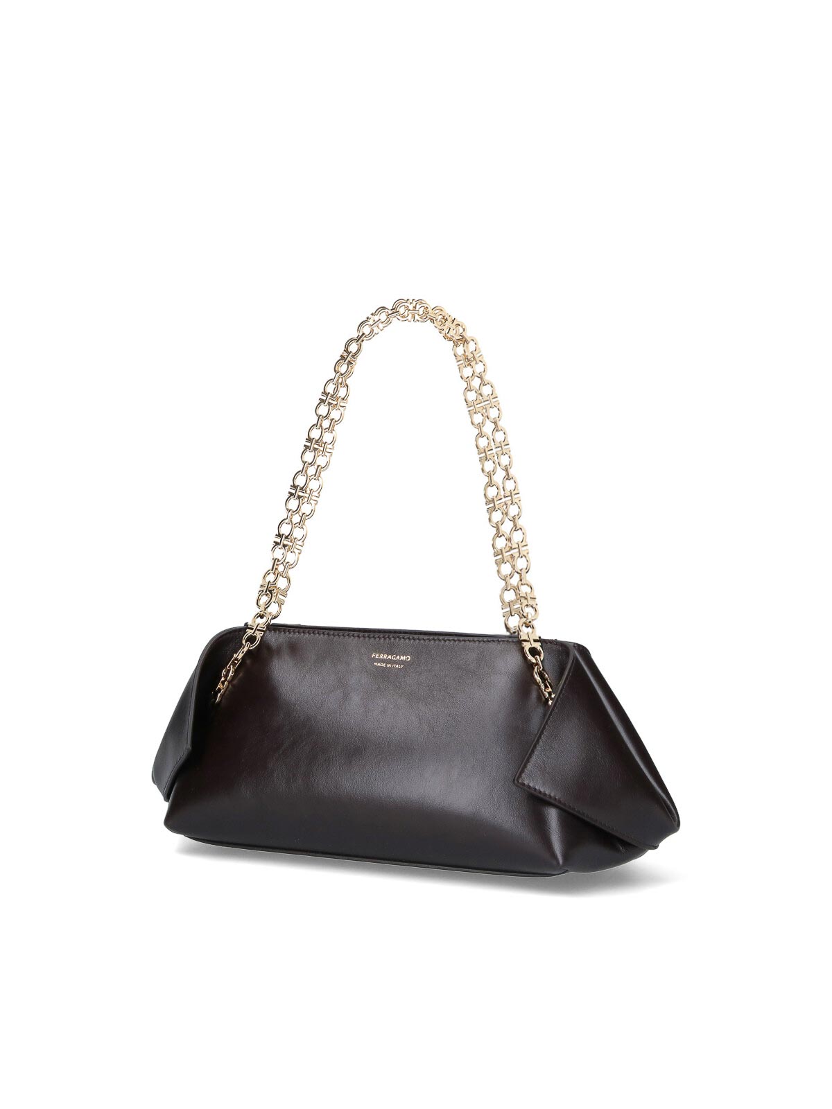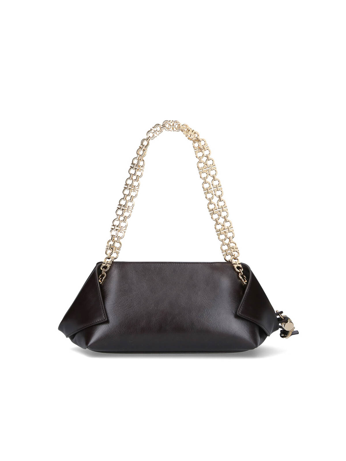 Schultertasche mit Ferragamo-Logo, aus braunem Kalbsleder, dunkler Farbton, goldener Gancini-Schultergurt aus Metall, doppelter Reißverschluss und Magnetverschluss, Charm-Detail und abnehmbarer Schlüsselring, gefaltete Seitenteile, goldener Logoprint auf der Vorderseite, ein Hauptfach im Inneren.