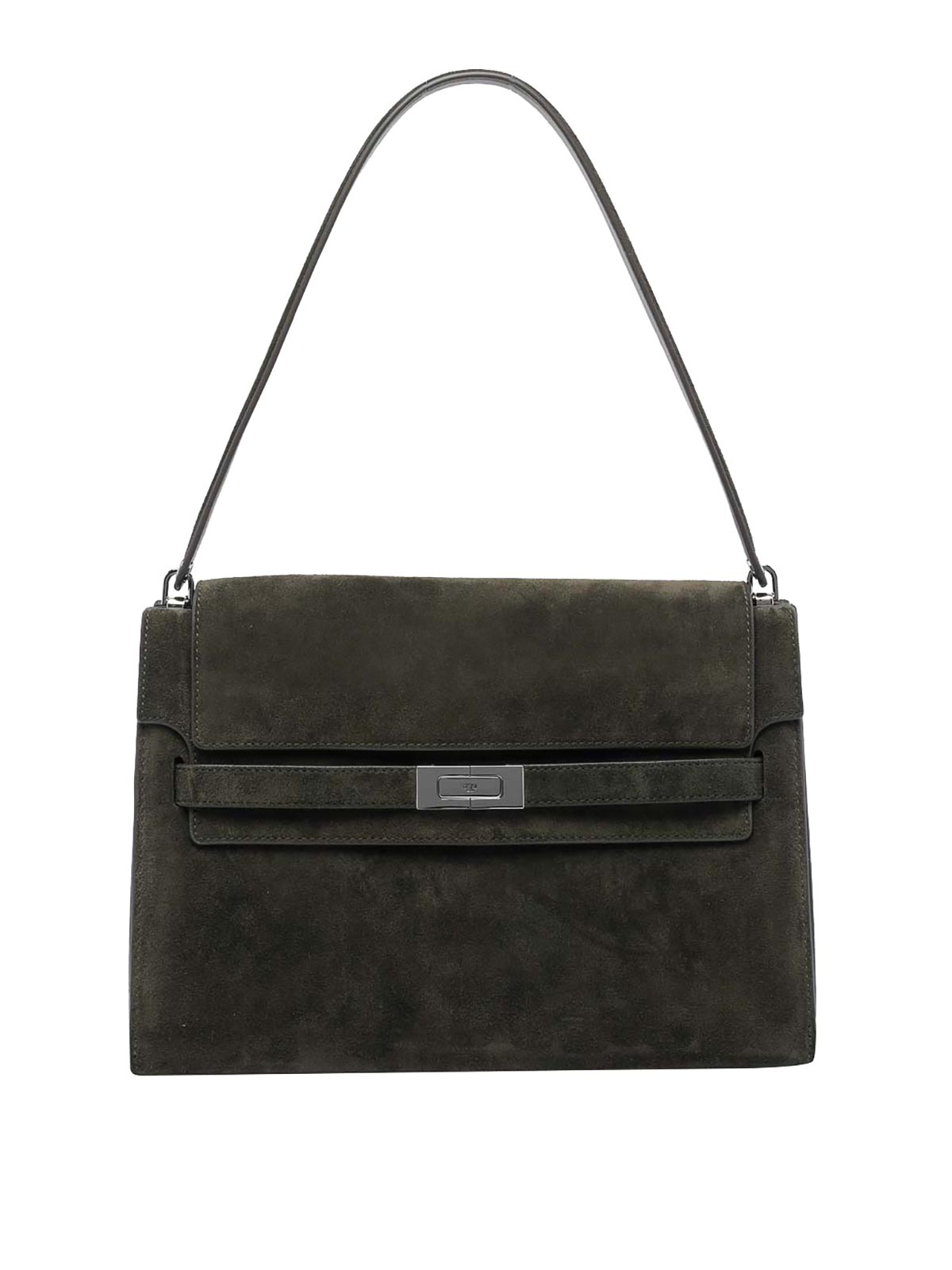Tory Burch Dark Leccio Große Lee Radziwill Schultertasche aus Veloursleder, Innentasche mit Reißverschluss, Außentasche mit ineinandergreifendem Verschluss, 1 Schultergurt, Obermaterial aus Veloursleder
