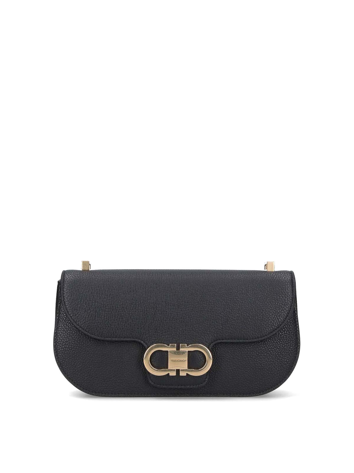 Ferragamo East-West-Schultertasche aus strukturiertem Kalbsleder in Schwarz, verstellbarer und abnehmbarer Schultergurt, Magnetverschluss, goldfarbenes Gancini-Logo aus Metall auf der Vorderseite, zwei interne Kartenfächer, zwei Hauptfächer im Inneren.